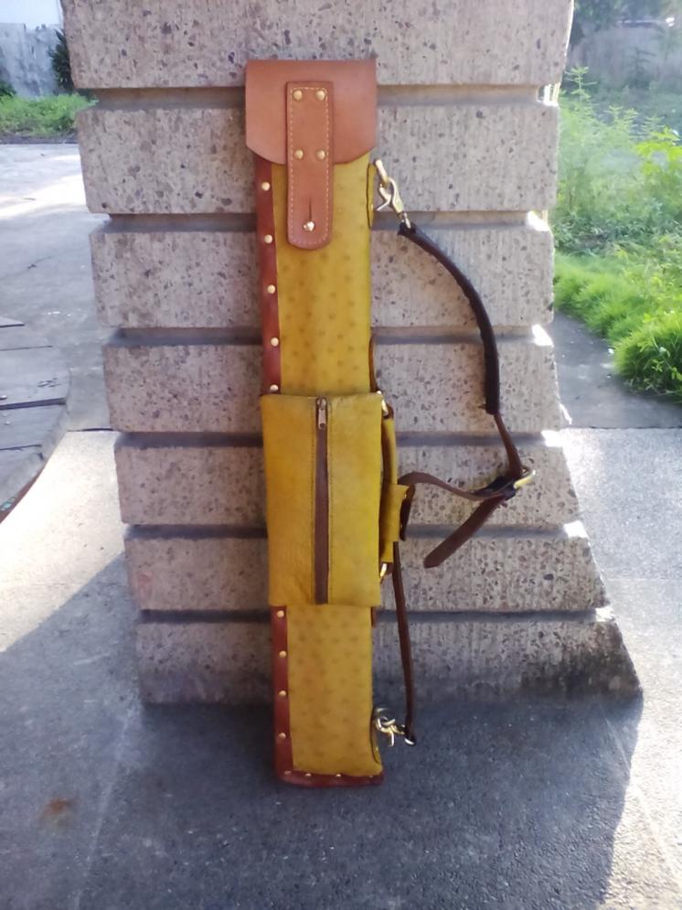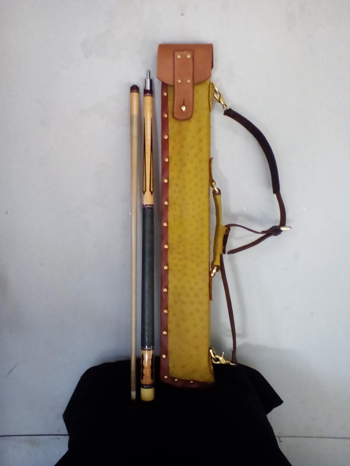 Selling this as a package. A grab-n-go case in genuine mustard color ostrich skin. Fits one butt 1 shaft, case has a detachable pouch. my cue which is an old Adam. Cue weighs around 19 to 19.2 oz, 57 inches overall length. Has a unique joint pin. Quick release but thick threads. Very solid stainless hit in my own opinion. Shaft has thin diameter more or less @ 12.6mm.