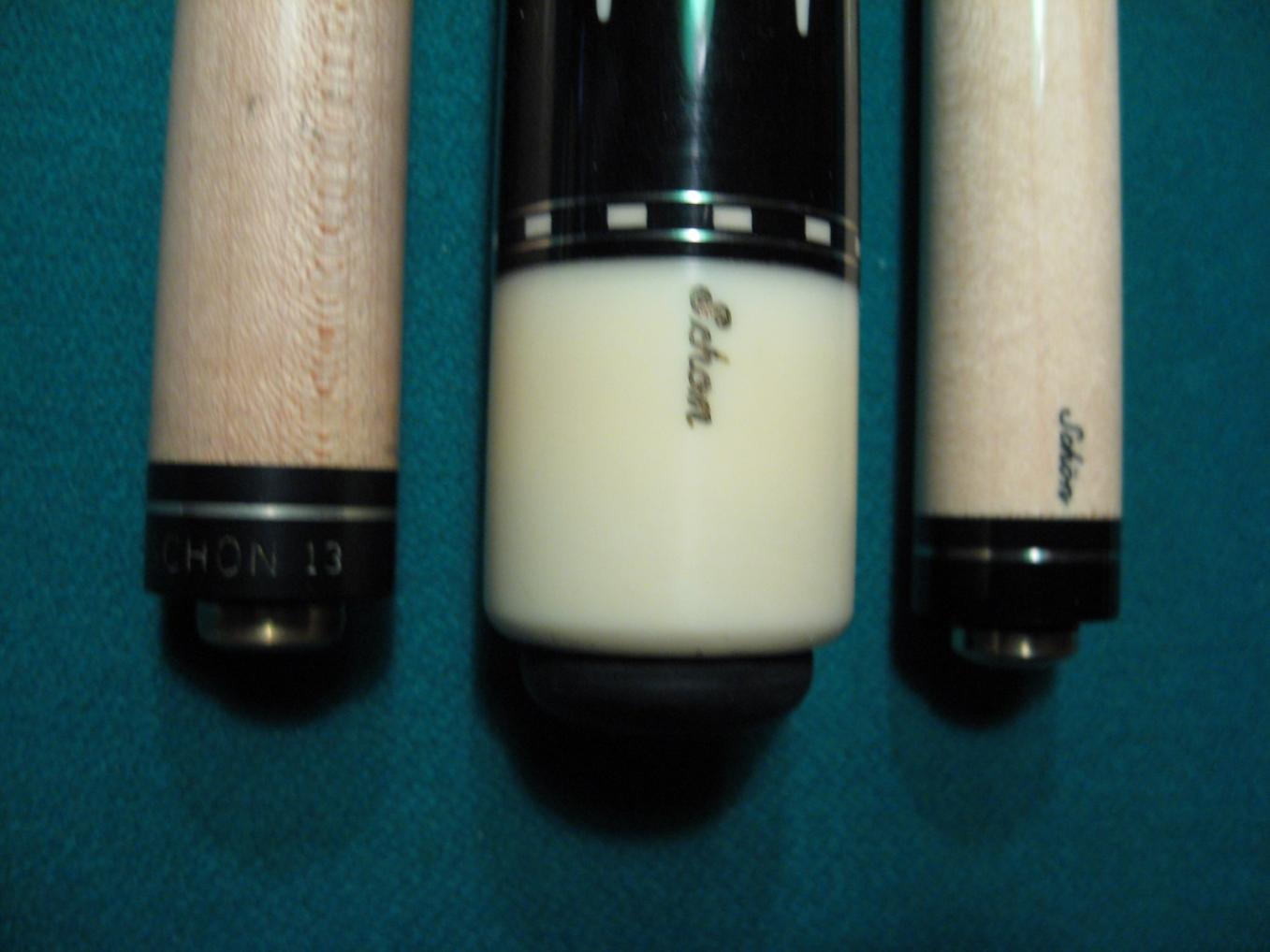 Fully refinished Schon SL-14 with brand new leather textured wrap. Butt straight as an arrow and weighs 15.7 oz. Original Stamped Collar Schon shaft weighs 4.0 oz and is 12.75 mm. The Schon Script shaft is 3.7 oz and is 12.7 mm. Both shafts have a small taper roll to them when looking under the shafts when rolled. Great Shooter, shafts will not harm shooting potential. No dings, no dents, no scratches. Great Old Schon Cue. A classic indeed This cue will be shipped usps priority express in the usa 48 state mainland and priority mail outside the 48 mainland.