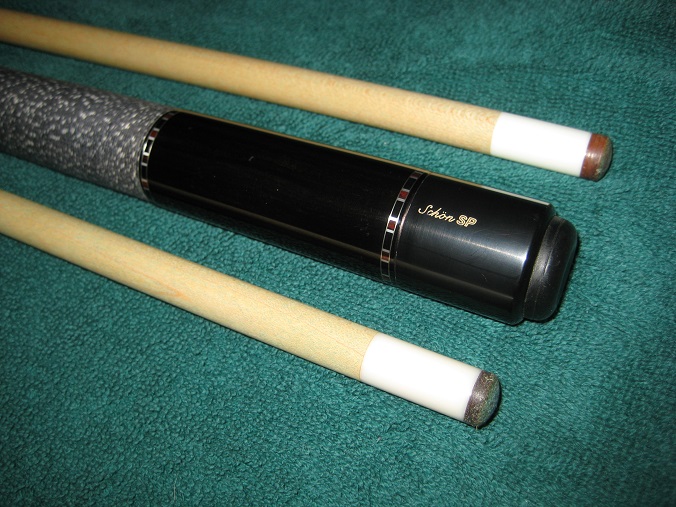 Offering for sale this rare Schon 6pt model SP. Cue comes with 2 shafts and custom joint protectors. Condition is excellent with a very hard to find nick in the butt sleeve. Butt is 14.9oz.. Linen wrap.. Shafts are 3.8oz/12.72mm and 4.0oz/12.85mm. Cue plays very sound and hits like an early Schon. You will not find a sharp pointed Schon for less money.