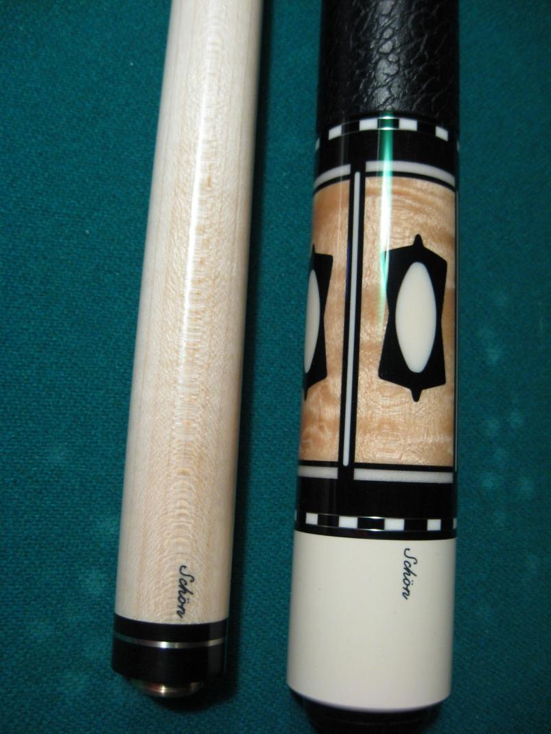 Schon Shaft 13 mm weighing 4.4 ounce and butt weighs 15mm for a total of 19.4. Has the Schon Factory "Monkey" black leather wrap. Comes with Factory Schon Joint Protectors.