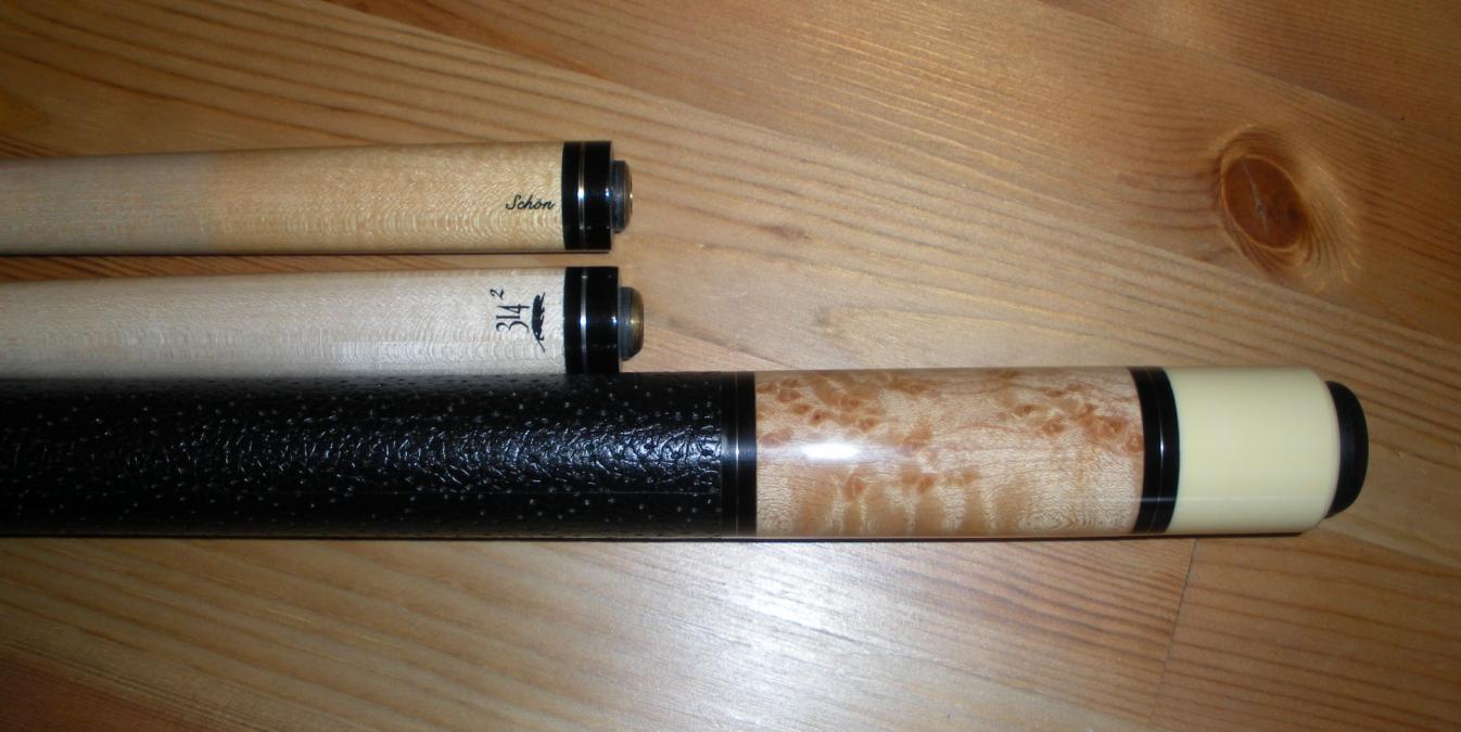This cue and shafts are straight and have been well cared for. The only noticeable defect is a something of a scuff mark near the butt that is visible in picture #2. The paint looks chipped but the finish doesn't feel chipped. (?) Not sure how that happened. Also, the Schon shaft has a couple of very tiny light dings that should come out easily with light sanding during a professional cleaning. Finally, you can feel slight raising of the finish over the joint ring. Other than these minor points, the cue looks very good.