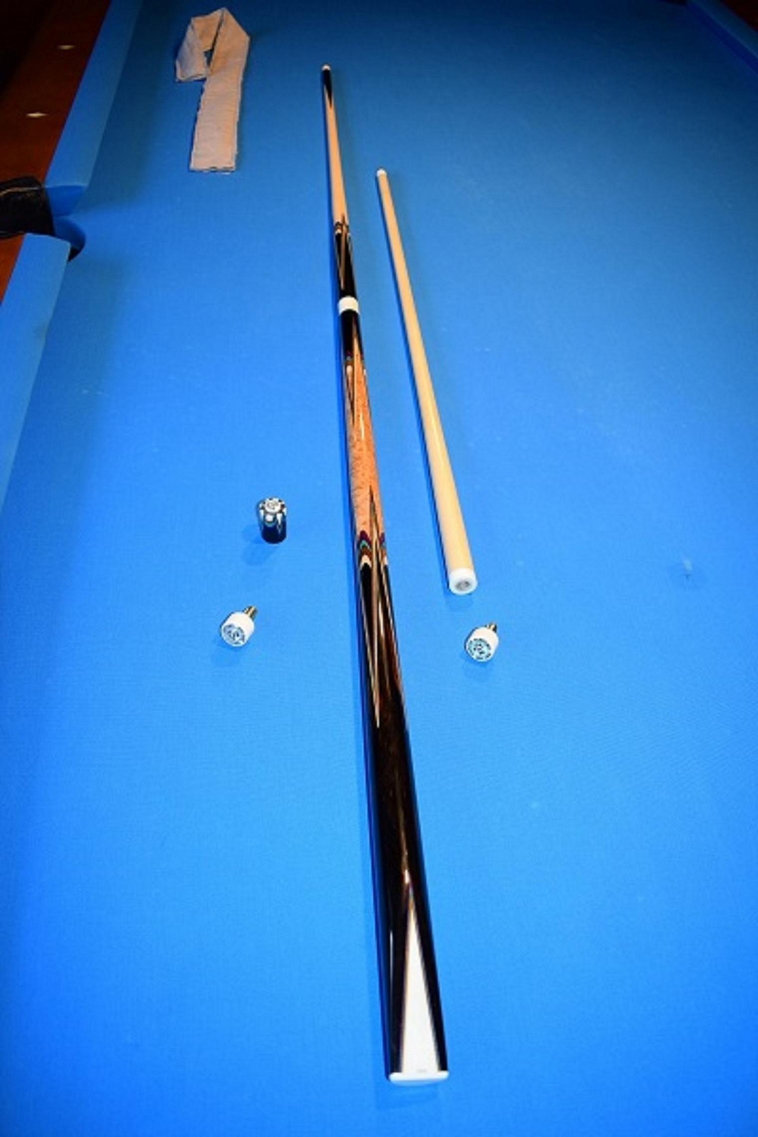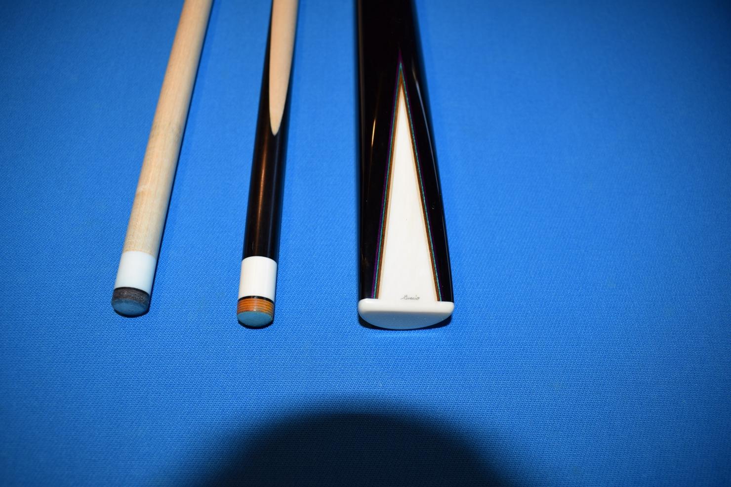 Cue is in excellent condition. No issues. Rolls straight together and apart. Lightly played. One shaft joint protector has a hairline scratch that catches your fingernail. All white is ivory except shaft 1 ferule is ageis.