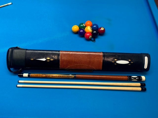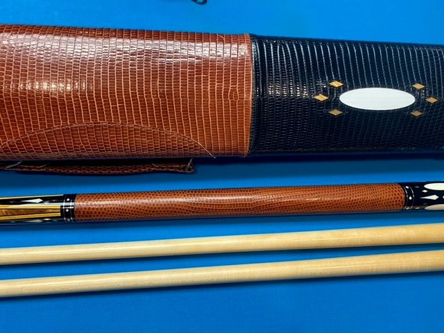 Here we have a super rare opportunity to acquire one of the Tasc Shop's 3 ever made "Golden Tascarella" cues. This one is in superb condition and comes with an amazing Whitten 2x4 case that was made to match this very special cue. I think Joe Whitten hit a grand slam on this one, please let me know what you guys think.I have owned 2 of the 3 Golden Tascs, one now resides with a good friend down south and another went to a guy we called Simon The Diamond over in the UK many years ago and I just learned that he sold it to a gent named Berny in Germany but do not know if he still has it or if not, where else it may be.