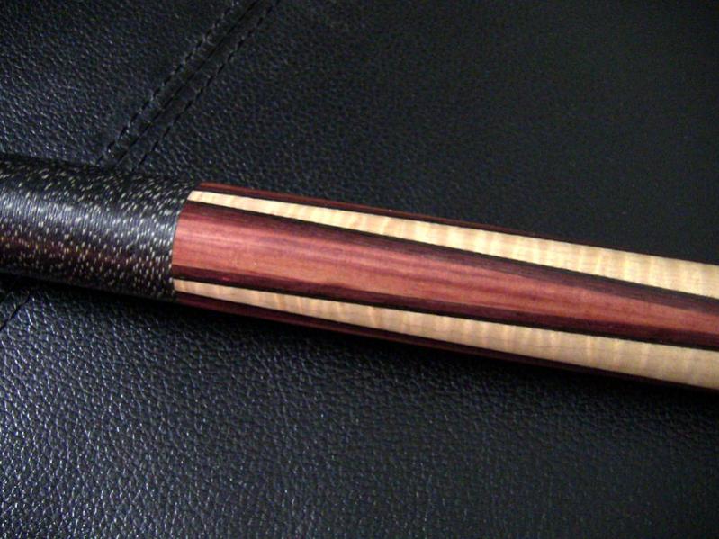Unusual veneer combination that I don't think I have ever seen before (3 maroon/purple veneers and an outer black), kind of gives the illusion they are tulipwood points milled into purpleheart. The hoppe ring down in the butt sleeve is not ivory, some kind of white synthetic material, and has the older TS logo. The black linen is obviously with old stuff, with a very noticeable, pronounced weave. Silver trim rings at the piloted ss joint (5/16-14).