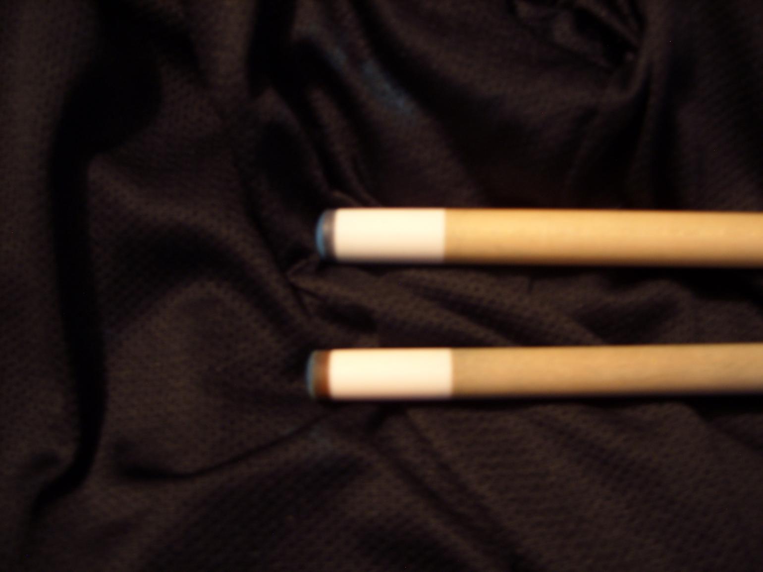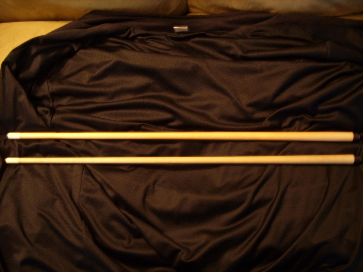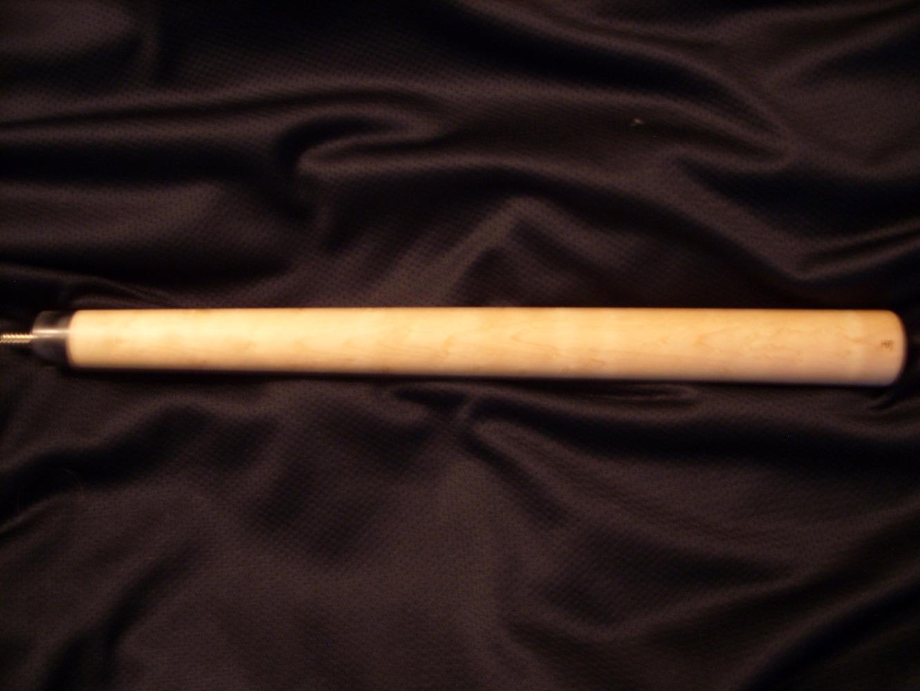 This is a Tim Scruggs Sneaky Pete with a matching Tim Scruggs sneaky jump cue. the butt and shafts are straight the diameters of the shafts are (12.6mm) and (11.6mm). the 11.6mm shaft comes with an ivory furrel and all shafts and butts are interchangeable with solid black collars. the weight of the cue is 19oz.