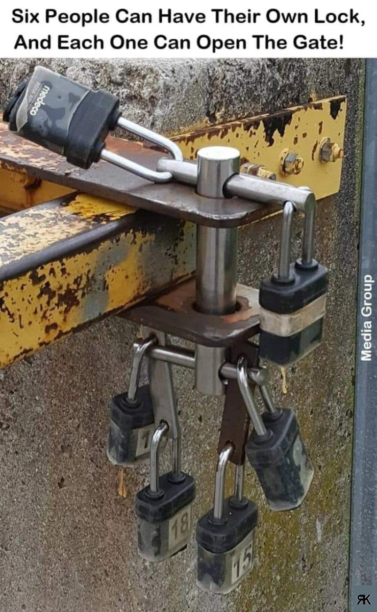 Those appear to be all medeco high security padlocks. The way they are being used prevents a numskull from locking the chain so as that not every padlock can get in. Your point is valid but this is idiot proof.