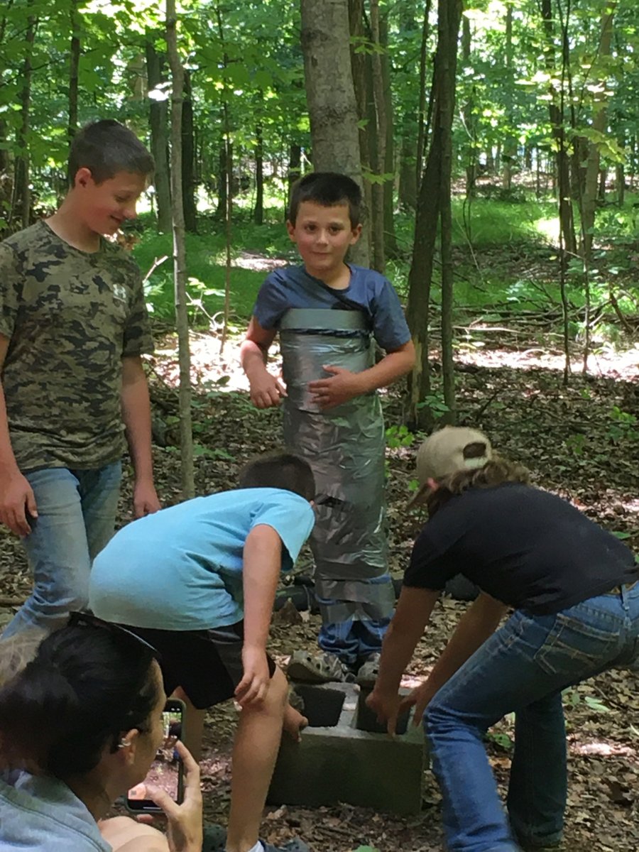 Cousins campout. Boys had him stand on the block while they wrapped him in a roll of duct tape.