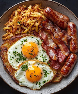 Damn.Obviously a food day for me! Toss that funny looking sausage, maybe keep one piece for variety. Add bacon. Get rid of three-fourth of those hash browns, add grits. Is that toast wasting space under the eggs? Add grits instead, flavor with the eggs and more bacon. Sideboards would look good on that plate and it would hold more bacon!
