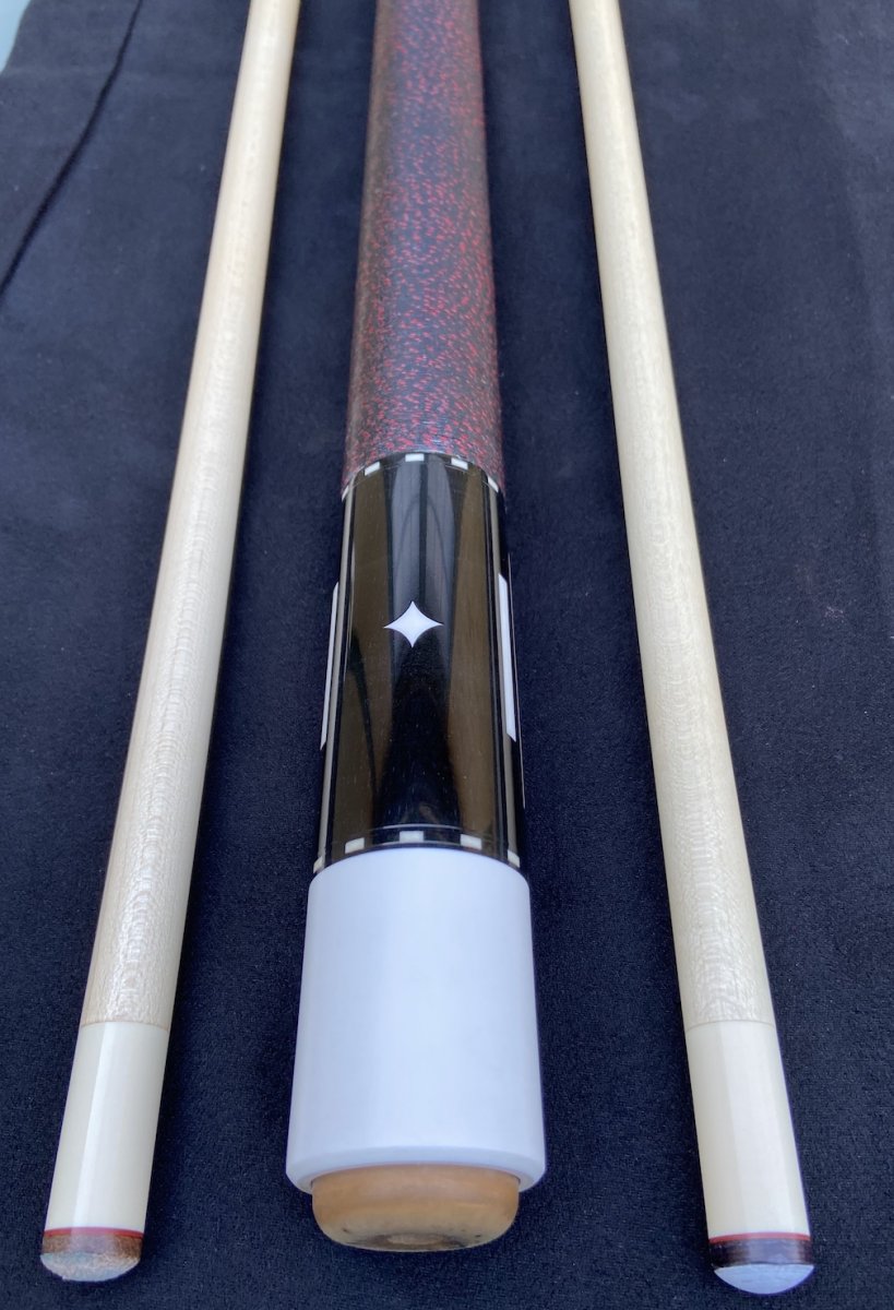 Butt - Ebony with three white lines/thin rectangles on two sides and a single white diamond on the other two sides. Butt cap is white delrin of some type. I put a cool brown bumper on the cue for an old school look, if you want the original black bumper I can send it.