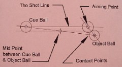 Here is a simple method of defining the Shot Line. Place your cue midway between Cue Ball & Object Ball on the Center Line between balls. Rotate Cue to point at the contact point on the Object Ball. Move Cue parallel back to the center of Cue Ball a shoot parallel to the line passing through contact points of Cue Ball & Object Ball. See picture...