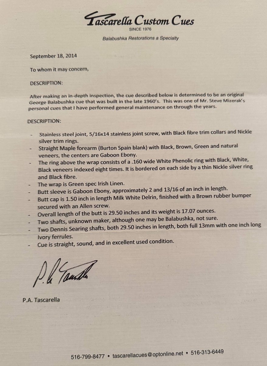 Here's a pretty special cue for all you guys who love George Balabushka cues that was owned and played by Steve Mizerak. $15k thanks!