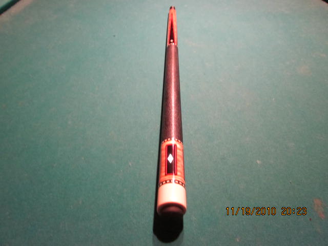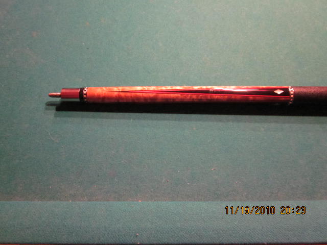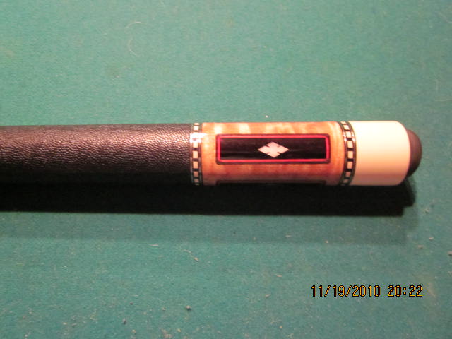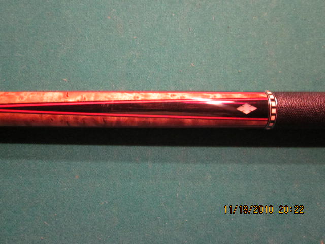 THIS CUE WAS JUST REFINISHED AND REWRAPPED BY ANDY, AND IS IN VERY NICE SHAPE. BUTT OF THE CUE HAS 4 EBONY POINTS, AND 4 EBONY VENEERED WINDOWS IN THE BUTT. MOTHER OF PEARL NOTCHED DIAMONDS IN EACH. MAPLE NOSE AND BUTT SLEEVE. PILOTED STEEL, 5/16 14 JOINT, NICE RINGWORK AT ALL THE SPOTS. BLACK LEATHER WRAP. BUTT WEIGHS 16.3 OUNCES, AND HAS 2 STRAIGHT SHAFTS. THE NEW SHAFT IS 3.8 OUNCES/13mm, THE PLAED SHAFT IS 3.9 OUNCES/12.5mm. I'M ALSO INCLUDING A 3RD SHAFT, THAT IS 3.6 OUNCES 12.75mm. IT COULD BE PLAYED WITH, OR EVEN USED TO MAKE A MATCHING JOINT PROTECTOR FOR THE BUTT.