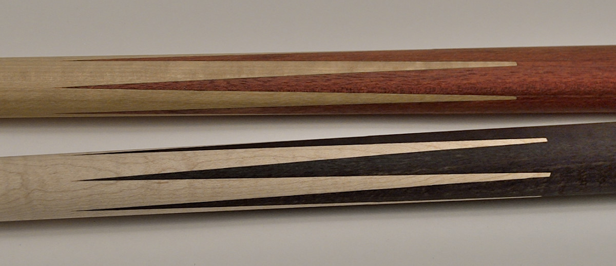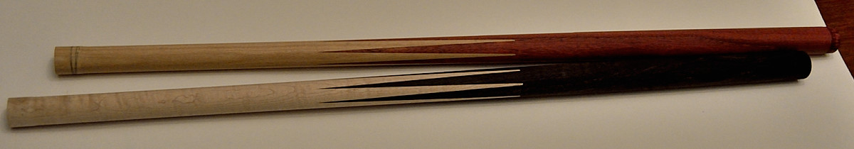 Got impatient and close to final sized a couple today, after straightening the points on the cones. (moving the centers, to straighten the points). As noted earlier, i just processed some wood that would (should?) be good cue wood, but was not "rare" since this has been an experiment. I did lose one cone, took too heavy a cut on a bloodwood into pau fero, god chatter in the middle and came out undersize. That's when i put the dial indicator up on the rail.