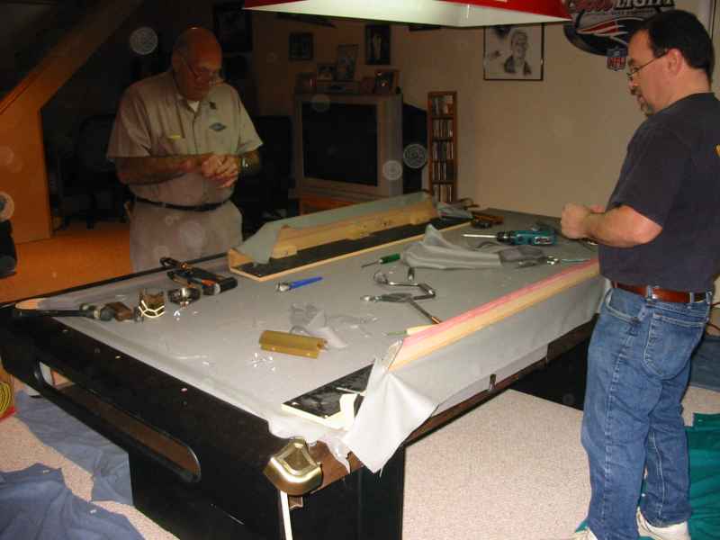In another post about a good table mechanic in the southeast I asked who was good in the northeast.A reply was Al Conte.As I read that he was in my basement putting Simonis 860 on my table.Here are some pics of him working.Great job guys.I love my new cloth.