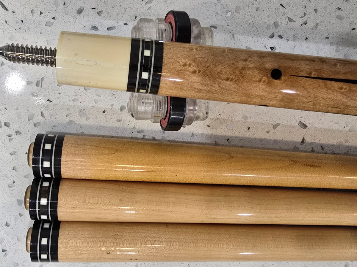 I can say this, Miz and Martin had the fanciest ones I had seen as a kid. Other than this one, the one I saw sell had the simple veneers over the butt cap. My uncles second cue was a rosewood four pointer. His fanciest was the one he sent to AZ, if had mitered windows and some wood trim rings, nothing over the top. I agree with you, the cues were made for action, fancy ones are very nice, but I can say this cue has seen some real money and tough action.