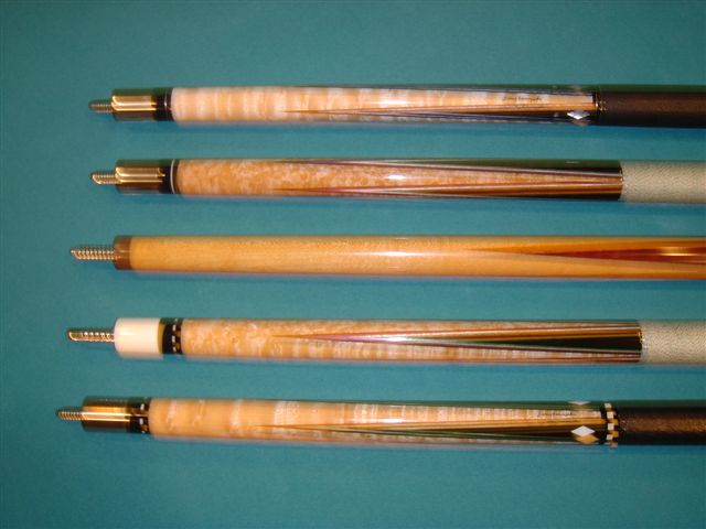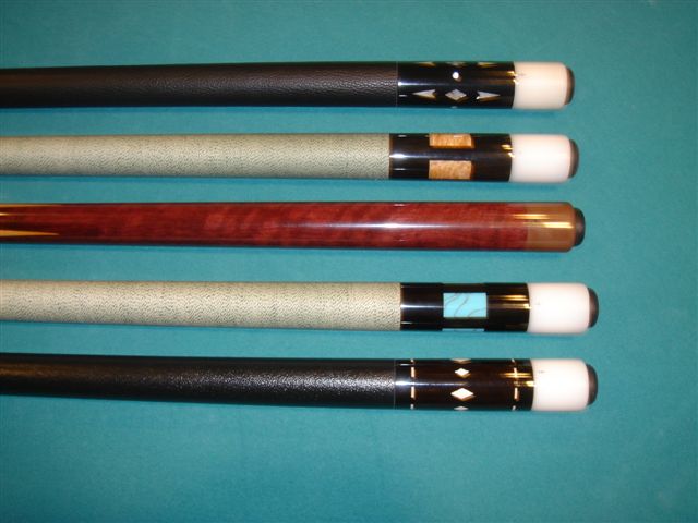Happy B-day, my friend. I miss the days in Reading, PA when we were young guns. Here are my 5 cues. The middle 3 Jerry made me last year. The one with the ivory joint and turqoise inlays is really sweet. Check out the Purple Heart Sneaky in the center. I bet not to many people have a -R- Sneaky.