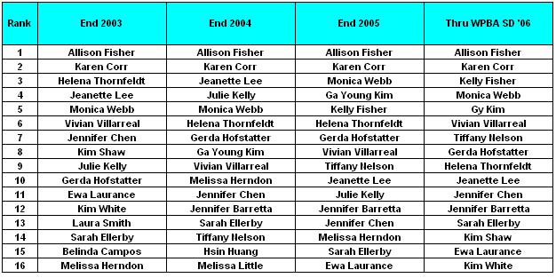 I wonder whether this is fair. How can you say that a player that was #3 as recently as the end of 2003 has failed to reach her potential? In case you need a refresher course, the WPBA rankings have looked like this in recent years.