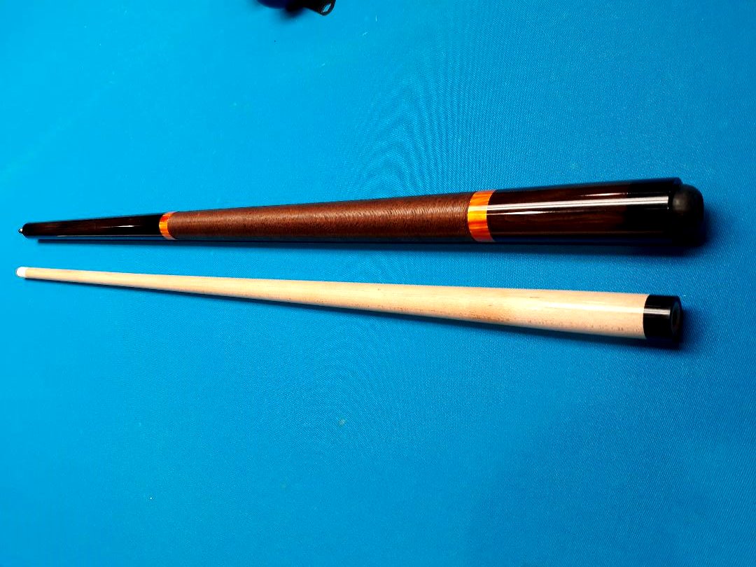 Cue is made of African Blackwood cored with purpleheart, old school brown with black speck linen wrap, very select shaftwood used featuring over 15 rpi straight end to end and some swirly orange acrylic rings for an interesting aesthetic. Cue has a radial pin and shaft has a Triangle tip, all things added together, we ended up with a very crisp, firm hitting cue with excellent balance, great feedback and, imo, a terrific understated look.