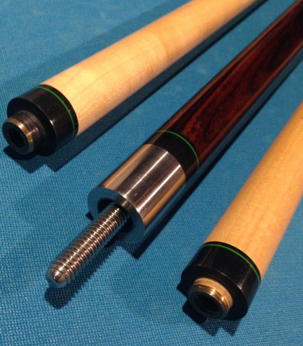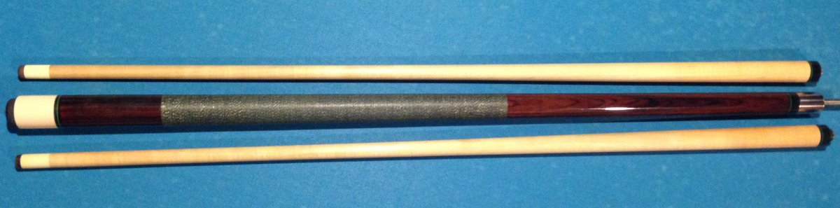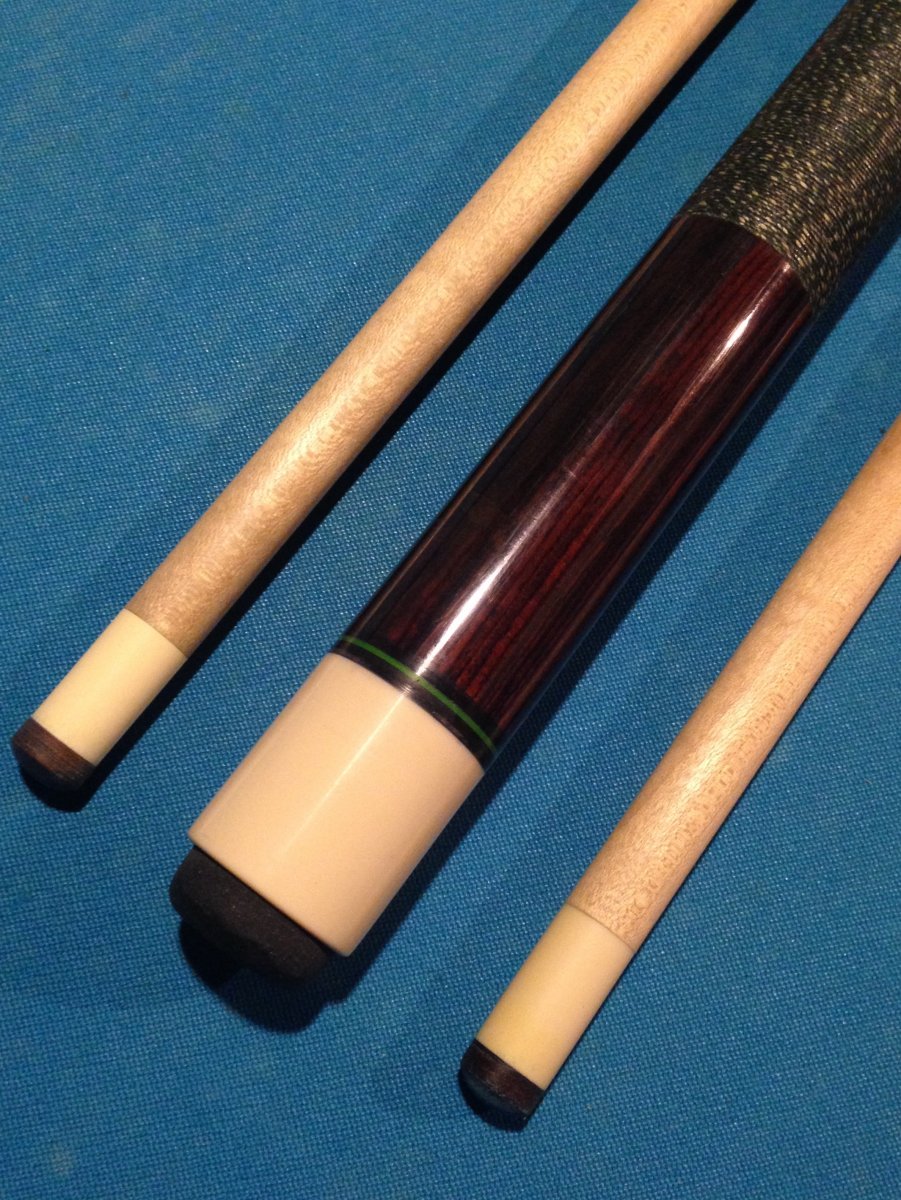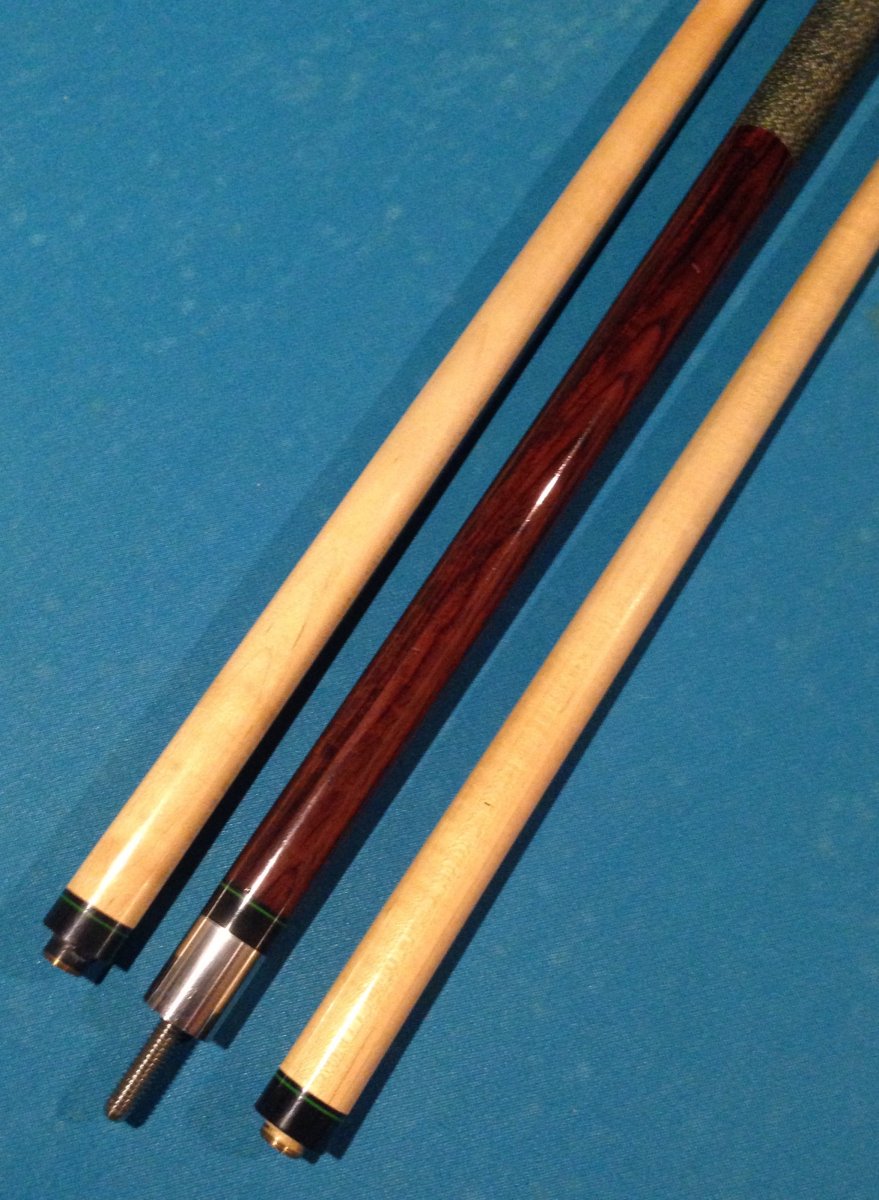 Was told maker was Dino from the Milwaukee or Chicago area, possibly Round Lake. Has the look and feel of a Scruggs. See piloted joint. Long 5/16x18 pin. Cue is cocobolo with two super nice straight shafts. Possibly paper micarta ferrules. One shaft looks to have old Moori tip. Was told Cue was made in the 80's. Any help much appreciated.