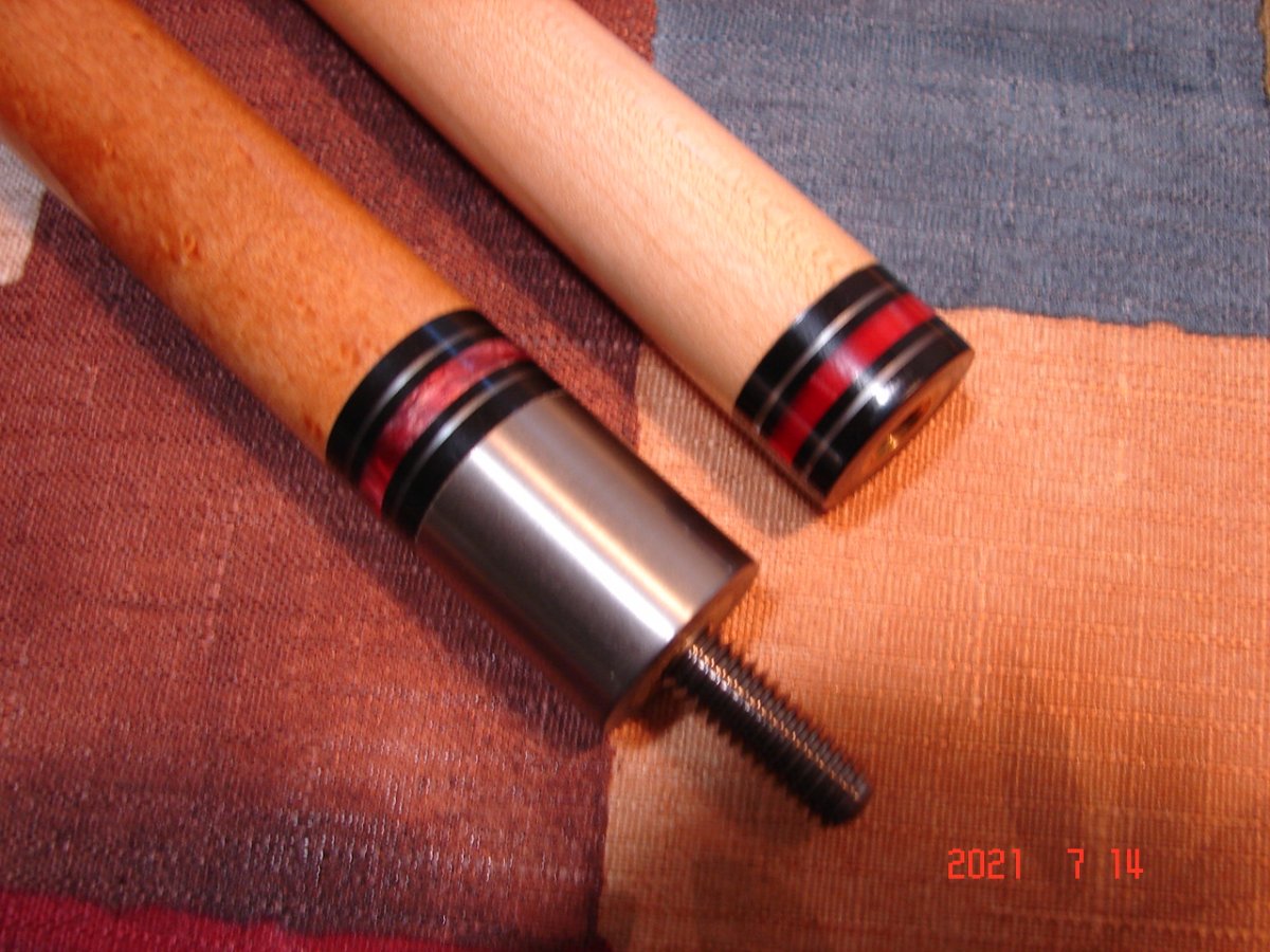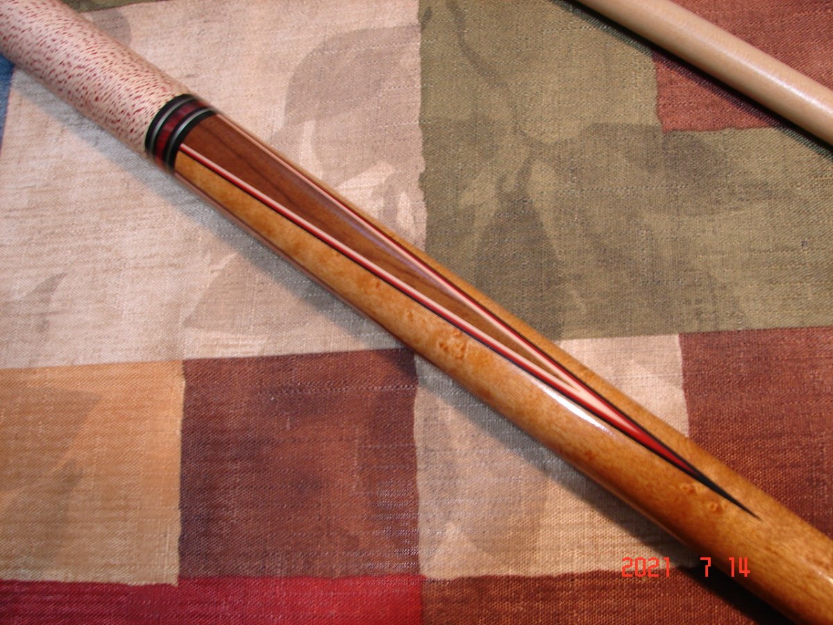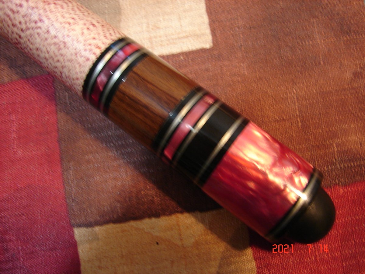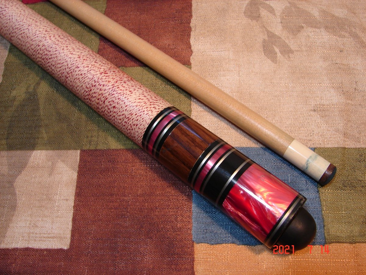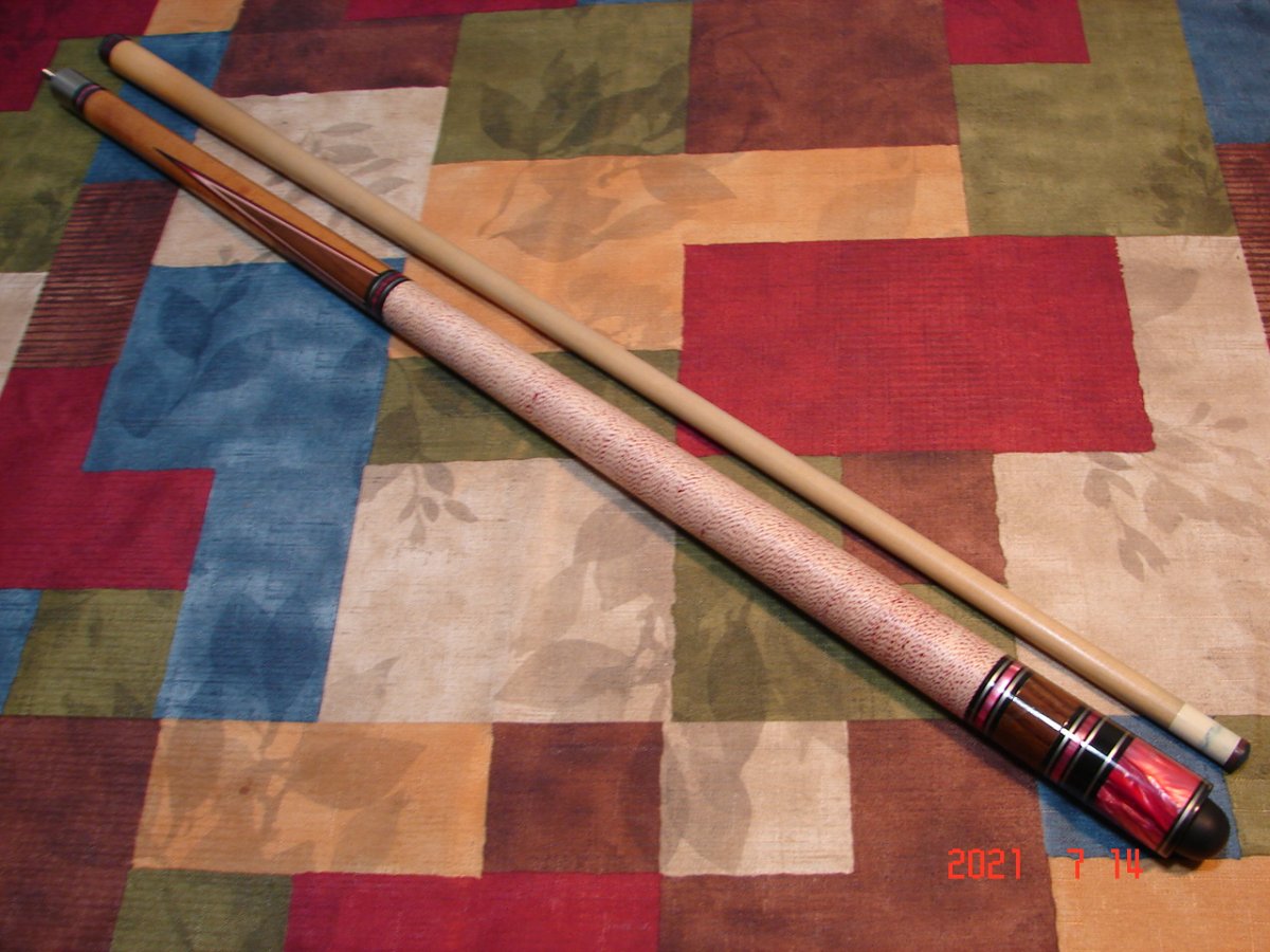 Recently snagged this very nice vintage Viking on eBay for a song & am at wits end trying to find the model and year it was made. I looked at hundreds of pics of Viking cues online and nothing. I tried the Viking catalog archive page at their website, but when I selected a catalog, it told me I needed to allow popups. I did this for this site only and no change. I'm sure others have had the same issue... Anyhoo, the cue has 3 points with red/black and white veneers, a white with red speck wrap & an abundance of ringwork as you can see. I could find no other Viking that had so many rings, especially at the butt. It has the Viking within an oval and USA just below logo. It also has an older style domed bumper. Any help would be greatly appreciated! Thanks - Mike