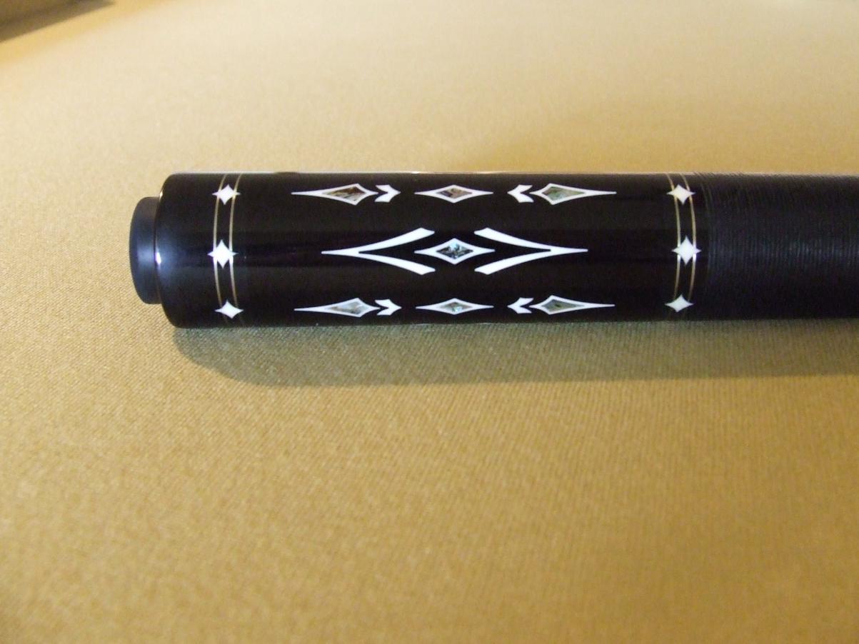 For sale or trade **TRADED** - This masterpiece of a cue by Ariel Carmeli is loaded with 84 ivory inlays. 8 points into an ebony forearm, 4 long ebony points with ivory "sconces" under ivory spears, each spear centered with abalone, 4 short highly-figured snakewood points between, all points set off with maple/black/maple veneers. Solid black Irish linen wrap, ebony butt with 56 ivory inlays, 48 of which are centered with abalone. Fancy rings at A,B,C,D & E, all with 8 ivory "star" inlays over double silver rings.