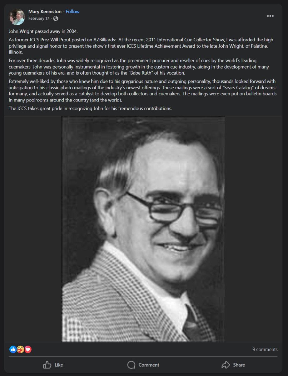 I will add a cue made by HARRY SIMS, USBA NATIONAL CHAMPION
