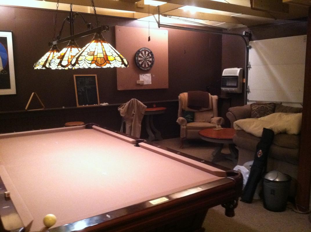 This is the garage at my parents house. Well...it started out as a garage. About 15 years ago my dad turned it into his woodworking shop. We had always kind of joked about getting a pool table. We have a big formal dining room with a big antique dining table we use maybe twice a year and every year around Thanksgiving we try to convince my mom we should just replace the dining room table with a pool table because it would get a lot more use. Well about 3 year ago at Thanksgiving Day dinner she actually put some serious thought into it as we were sitting at this ginormous dining table for the only time that year.