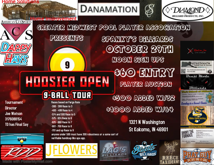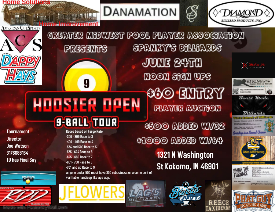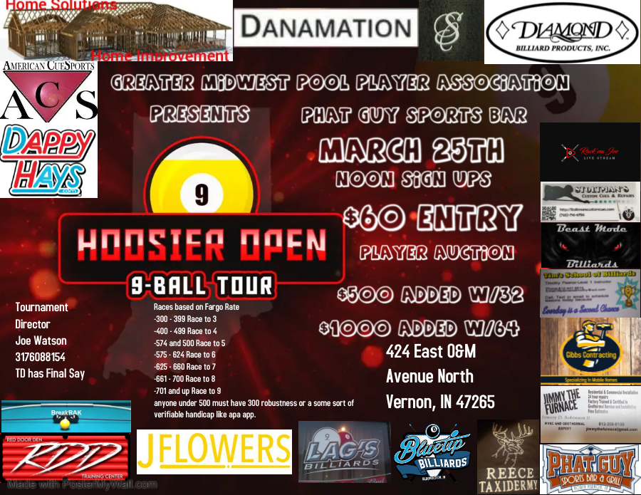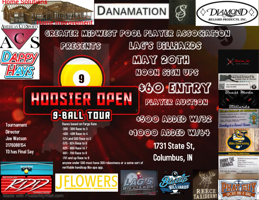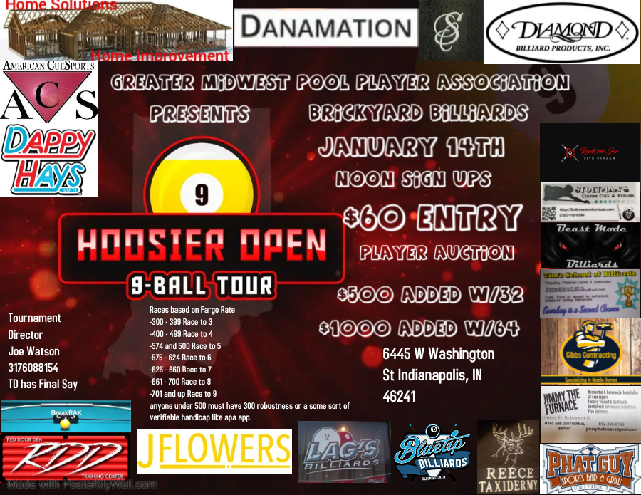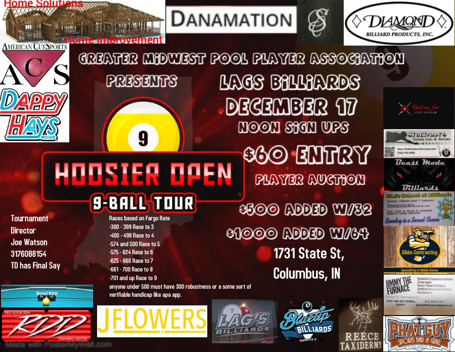 Here it is players the dates for season 7 of the Hoosier 9-Ball Open Tour.