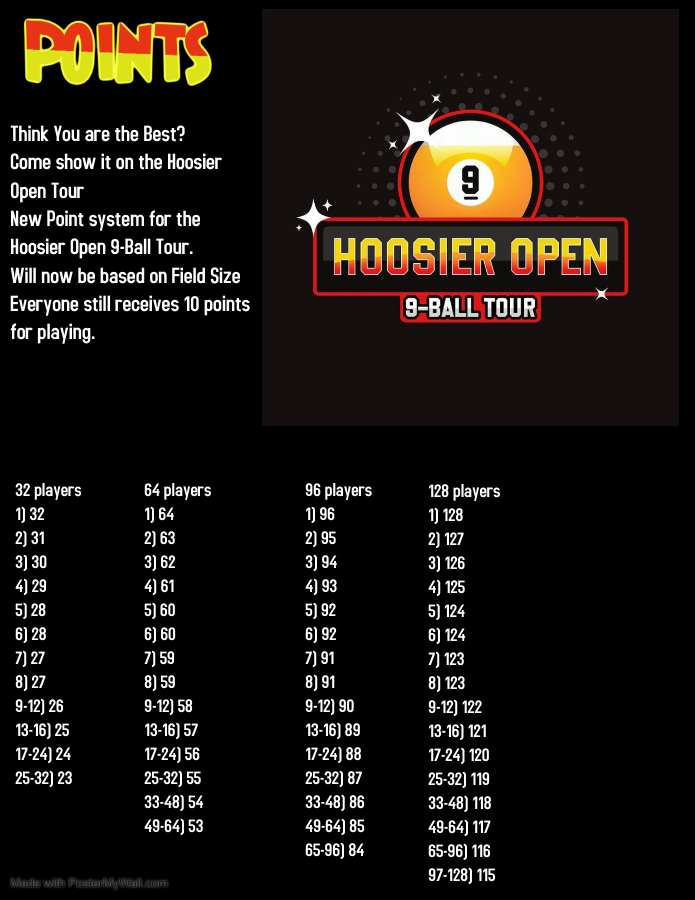 Howdy players we are just over a month away from the start of the new season Hoosier 9-Ball Open Tour Stop 1 . We have already started taking sign ups and have 17 players on the low side and 4 players on the high side. If you want on the list send us a message. You must pre pay to guarantee your spot we can get you on the list and everyone will have until Oct 19 to pre pay and confirm your spot or will be first paid and lose your spot. Let's start this season off with a bang and fill this first stop up. LIMITED TO 128 PLAYERS