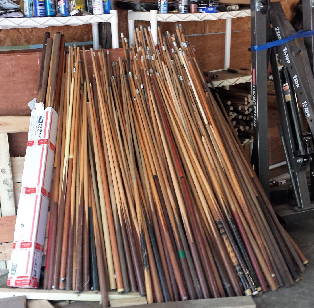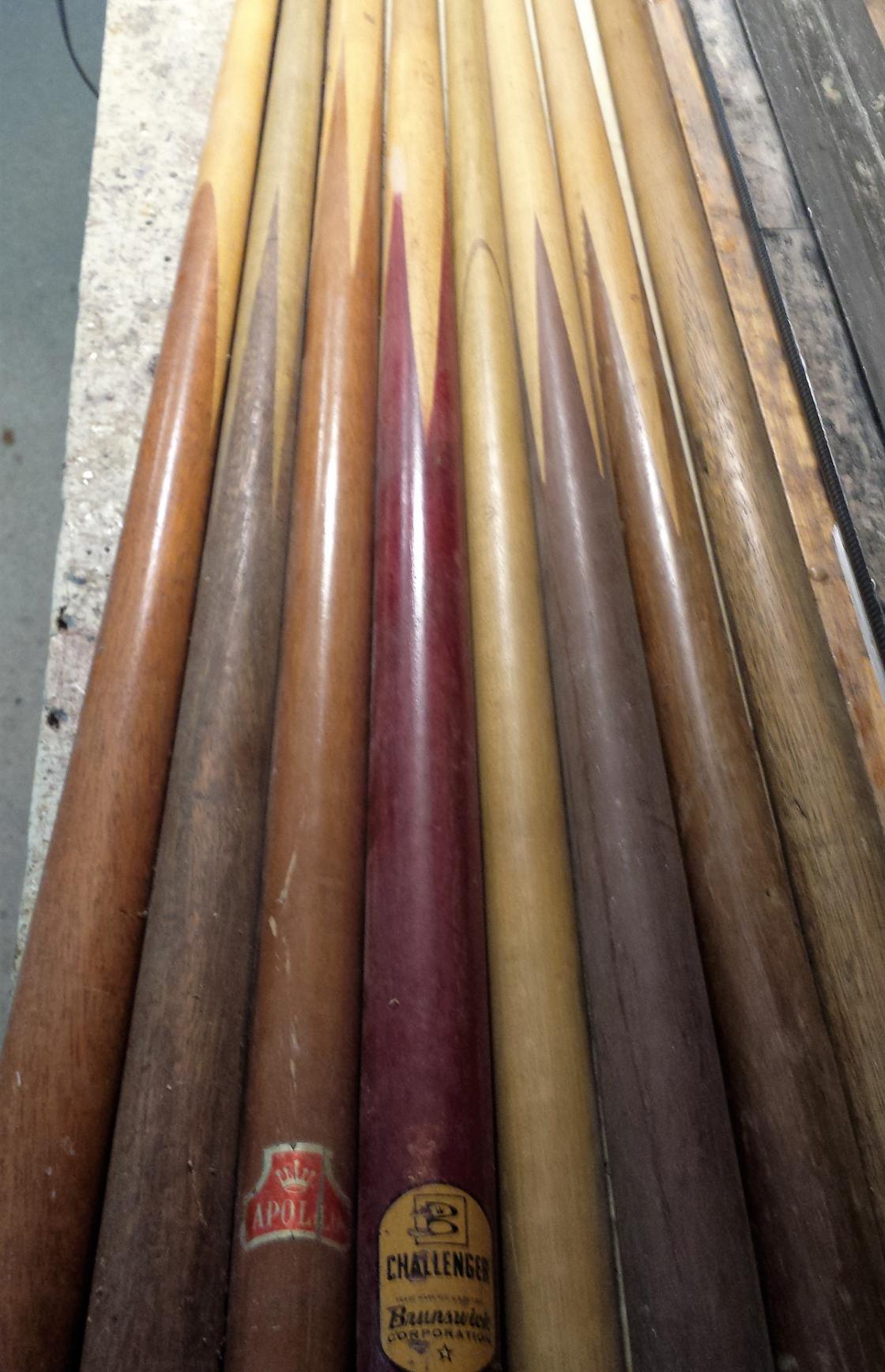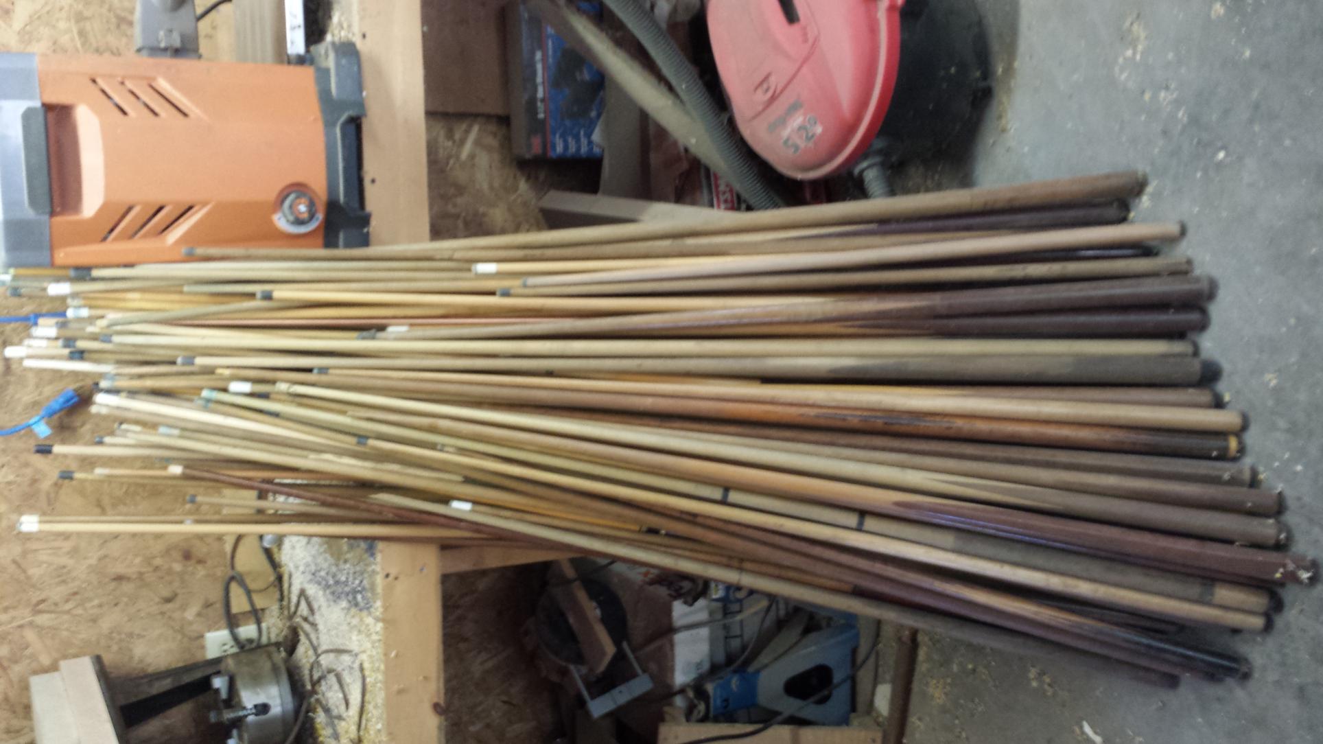 Old house cues, Valley, Brunswick, e.a. Smidt, and a dozen other makers. I use these for recycled shafts, cut just above the points where they are plenty thick and recut them. 40 to 60 year old wood makes some great shafts. also convert some of the prettier butt woods, and make sneaky petes, and its not bad when you need a really great piece of fully cured wood to use as a core, nice to have some 50 year old wood.