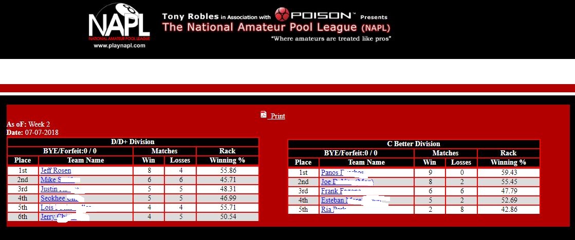 2) Mon night NAPL individual 9 Ball 8 Wins, 4 losses