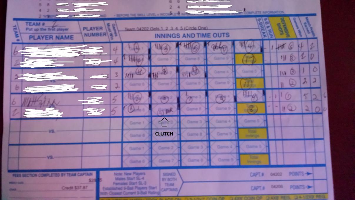 The best player on my NAPA 8-ball team (and by far the best player in our immediate area, in any discipline), only played one week this session (our first for any of us in NAPA). He played a guy in a 5-5 race, won the lag, had 3 Break and runs, winning 5-0 (we do not mark misses and makes or innings in NAPA, but he only had one miss, from a dry break then a lock down safety)...