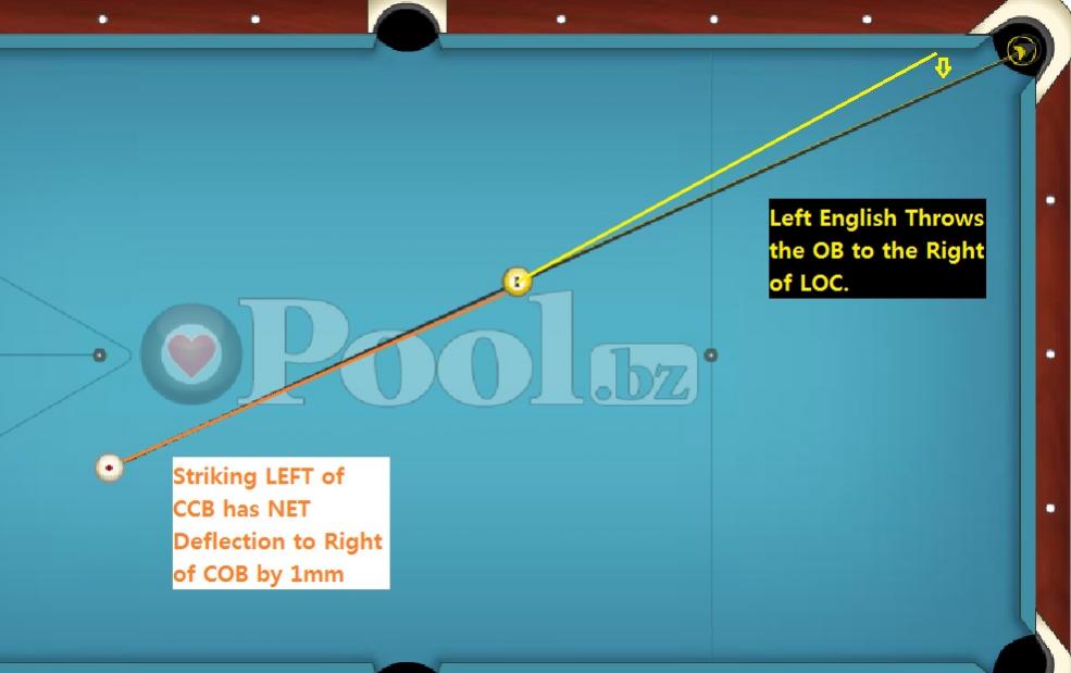 Hitting left of the CB does NOT however tell us what the resultant path of the CB will be. This depends upon the length of bridge the player is using and how this corresponds to the effective pivot point of the shot.