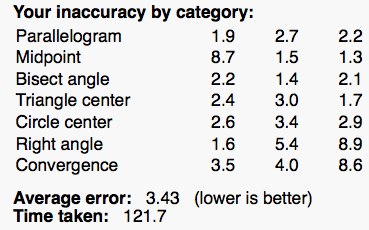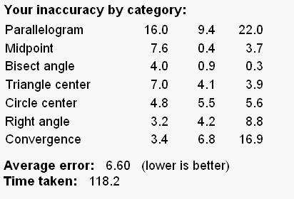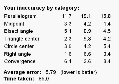 The Apple Magic Mouse is real twitchy, so I got a couple of movements as I let go, once on a parallelogram and once on a triangle center I'm sure it moved a bit. Besides that I did pretty good, I think. After spending the last 35 years sighting proportions by eye, I'd better be at least a bit better than average by now.