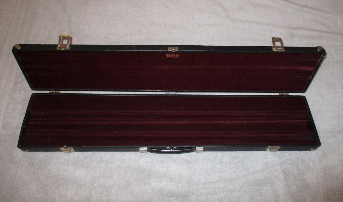 Hard to find 1x2 Huebler case with a full length storage compartment. This one is pretty rough with a number little nick sand dings in on the outside but still a neat old case. The inside is in good condition and is maroon although it looks red in some of the pictures.