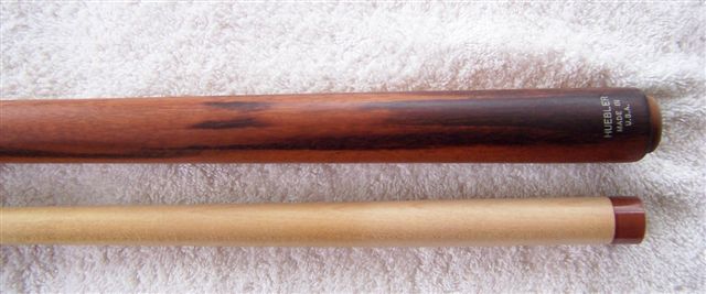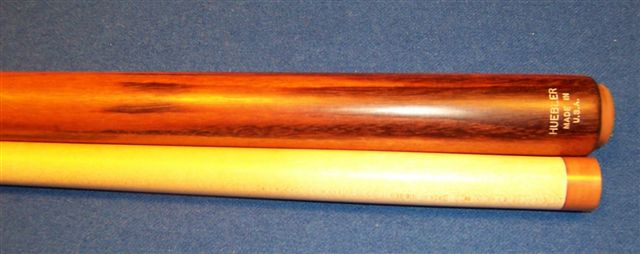 Found this older Huebler. Tryed to contact them but no reply. Would like to know the age of the cue but more importantly I want to know what kind of wood was used in the Butt. Sent the cue over to Ken, krbsailing here on the forum. Cue was really beat up so we took off the old finish. Shaft is not original but Ken did a nice job converting an older shaft for me. Turned it down at the joint and added the collar, new ferrule and tip. Cue plays outstanding. My first Huebler, and I have only $125 into it.