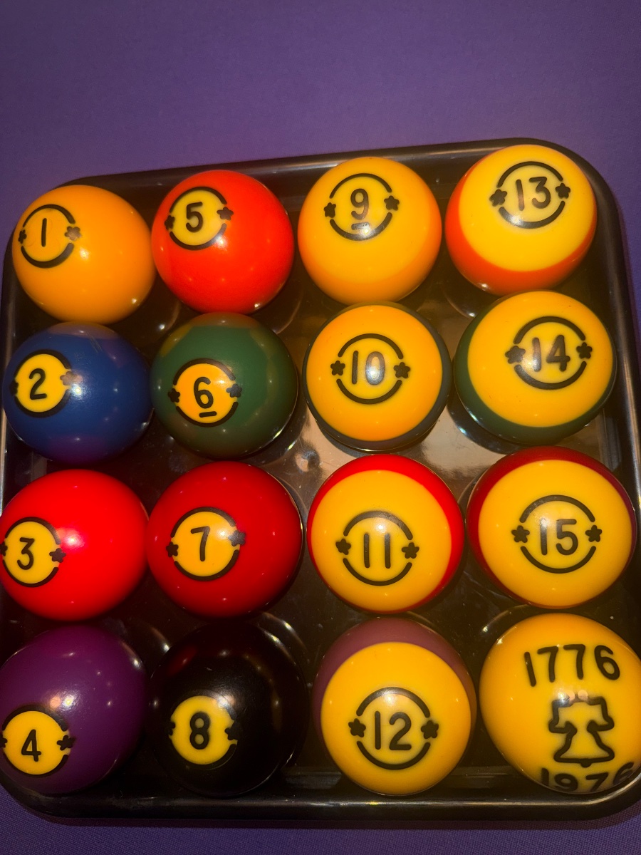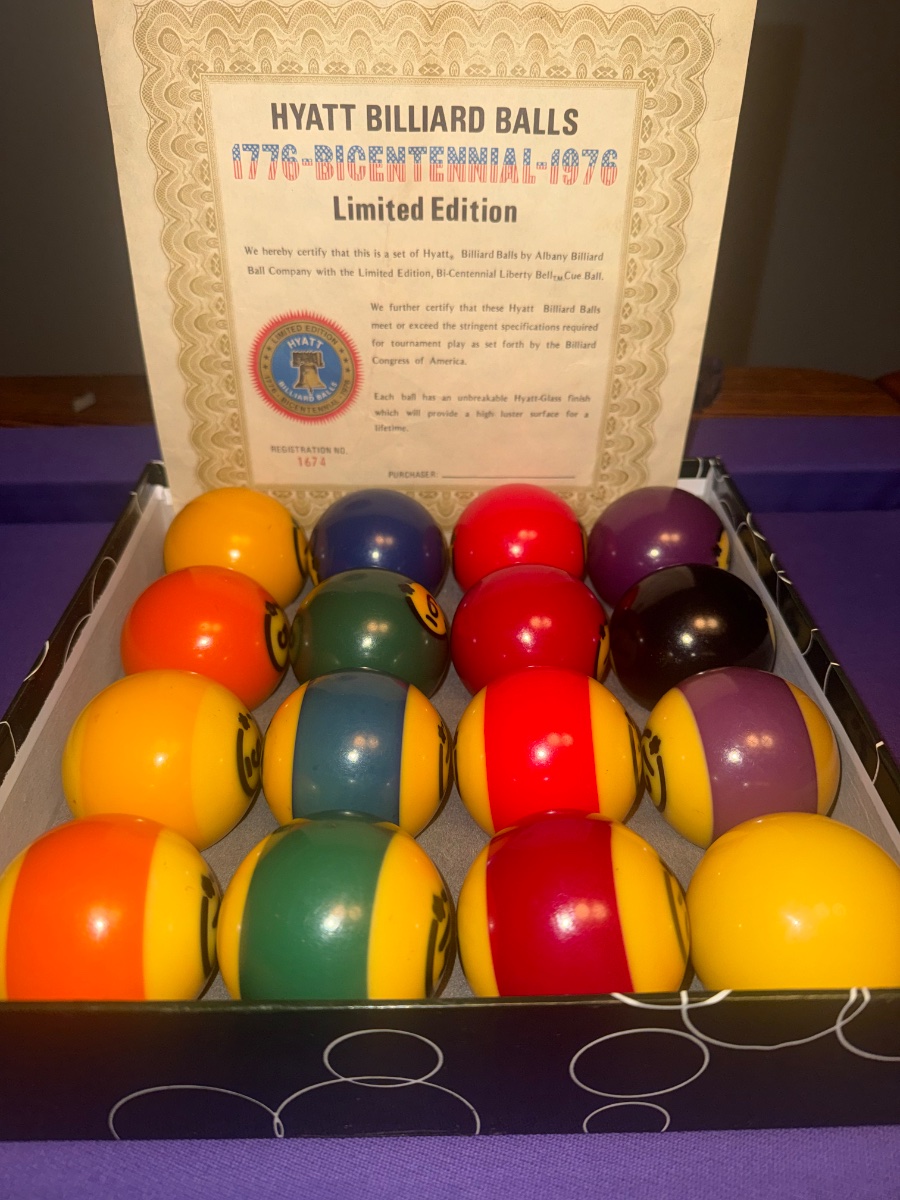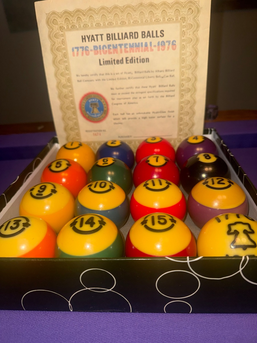 Vintage set of 50 year old Hyatt Bicentennial Balls.Includes the Liberty Bell cue ball and certificate of authenticity.Balls are used but In nice condition.$$250 PayPal and Venmo accepted Ships conus in a Generic ball box usps priority mail with tracking for $20.Cross posted on eBay.