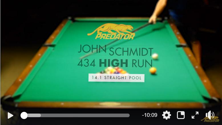 John Schmidt 434 Straight Pool High Run here https://youtu.be/lf9hRHdA0A8