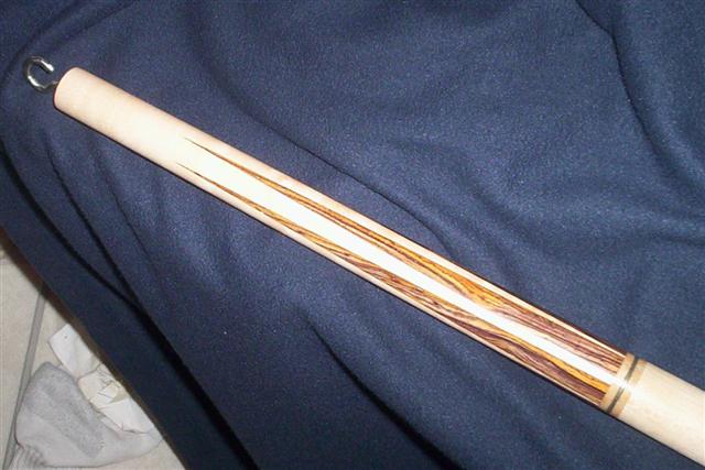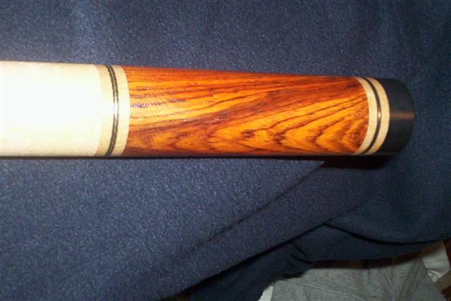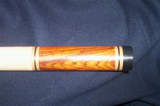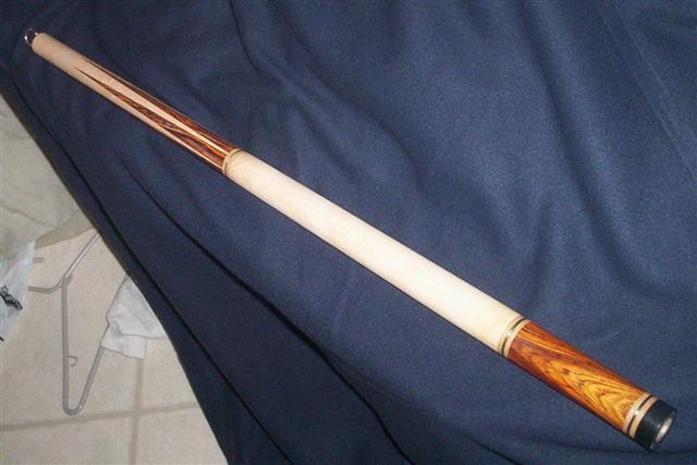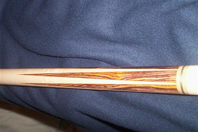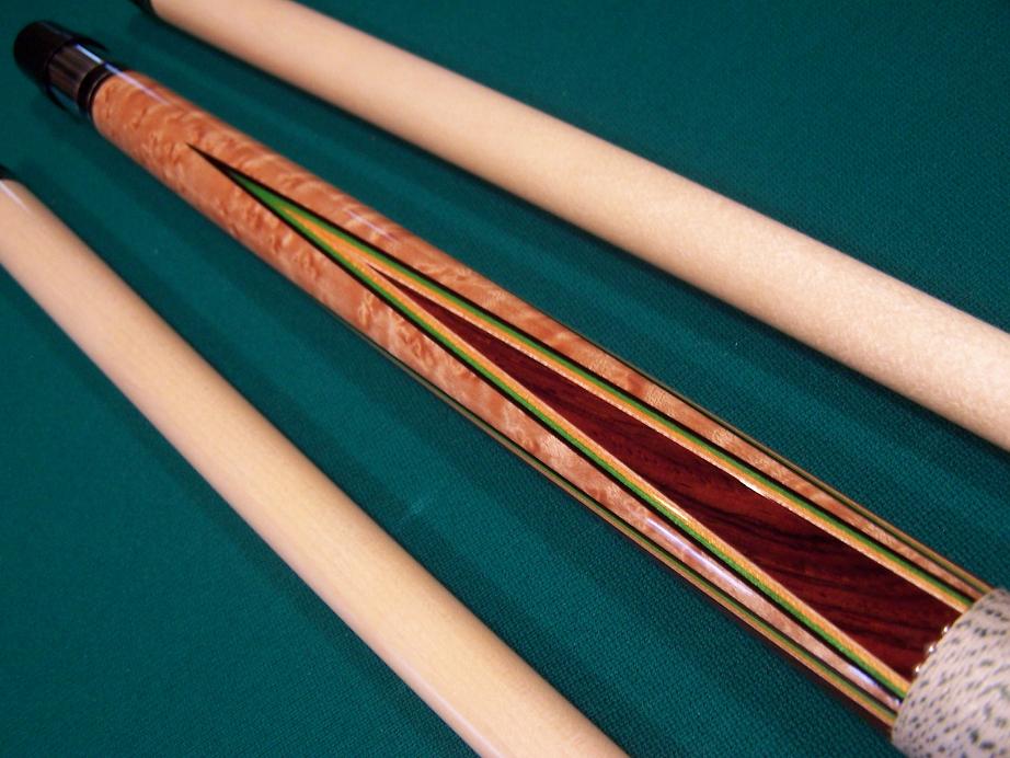 Cocobolo points with recut points of Ebony and Holly in Birdseye maple with some inlay work ---- JM1024 in my gallery on the website www.johnmaddencues.com (page two today but maybe pushed to page three in the next day or so when I get some new cues posted up).