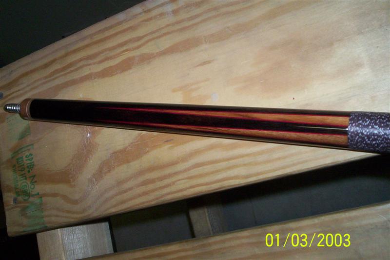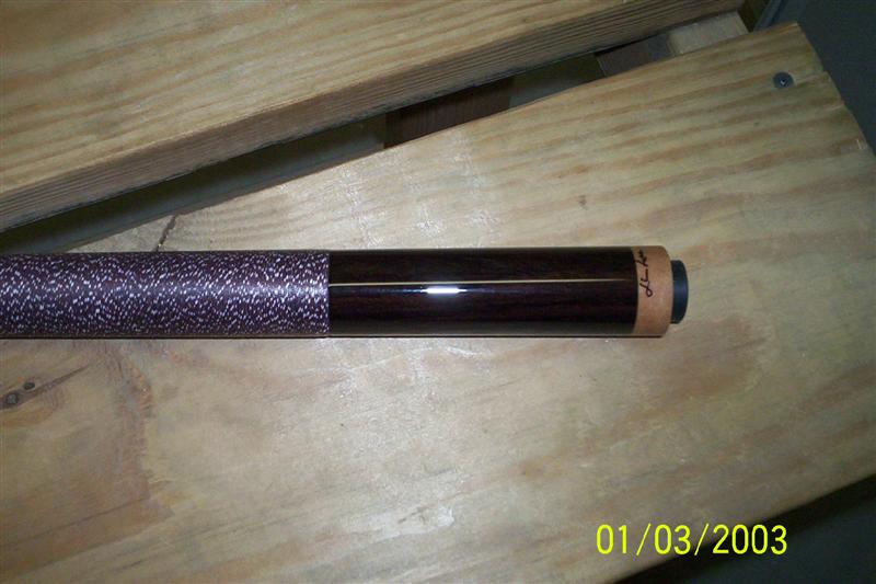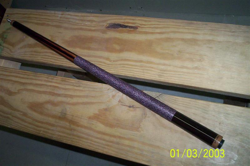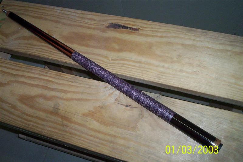 It has a burgundy linen with white spec wrap to finish it off. I am finishing the shaft now with clear and will be ready for sale in the next few days.