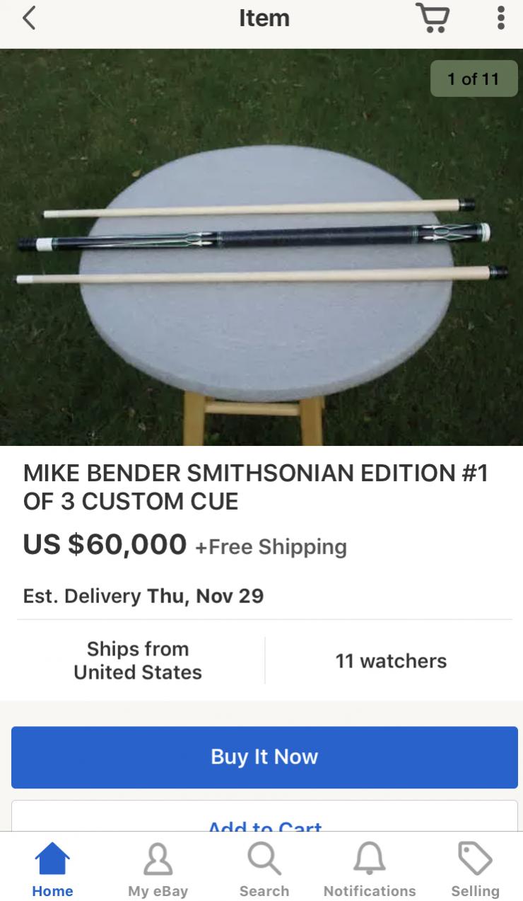 Not sure I posted this correctly. I never posted a link or picture before. Anyway what is the value of high end Mike Bender Cues??? Does being a duplicate to an actual cue in the Smithsonian add that much value??
