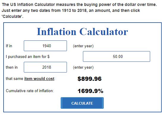 Here is what $20 in 1940, 1945, and 1950 would be equal to in buying power in 2018.