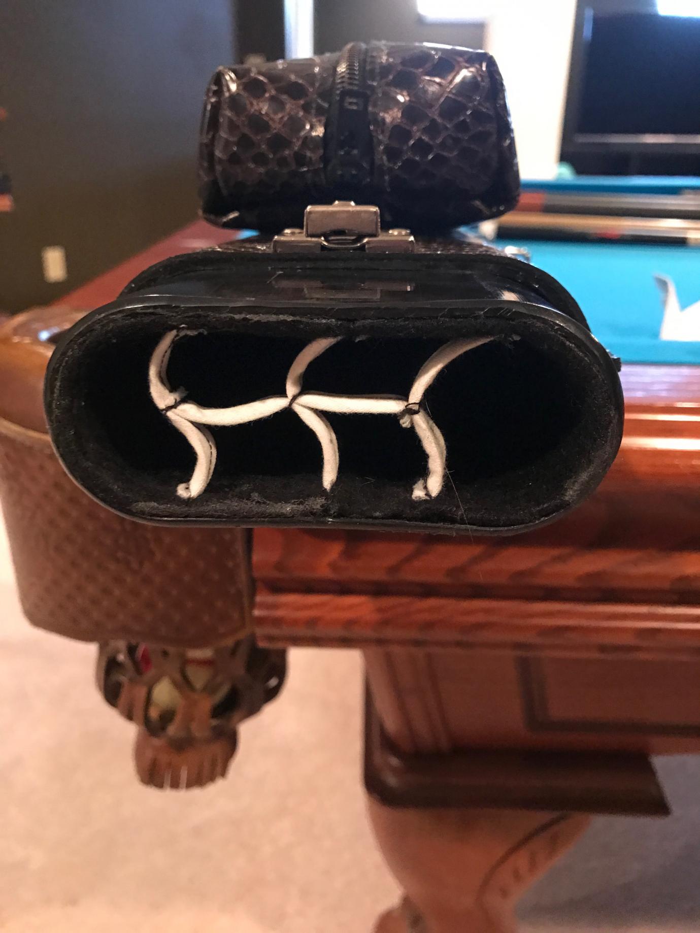 Black crocodile. Case in good condition. Has the springs in the bottom for easy