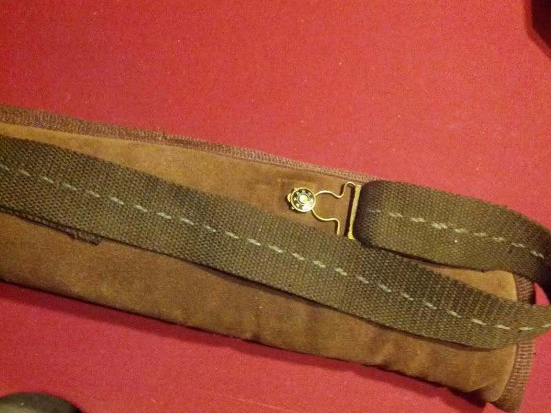 Just a simple button/rivet with a twistable strap holder. I found a fabric belt that matched the color of the case pretty well that I got for $3. Functional/ adjustable and comfortable.