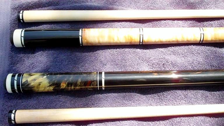The bottom cue Buckeye Burl ebony handle and ivory sleeved over stainless steel joint. Put your seat belts on and please enjoy the view.