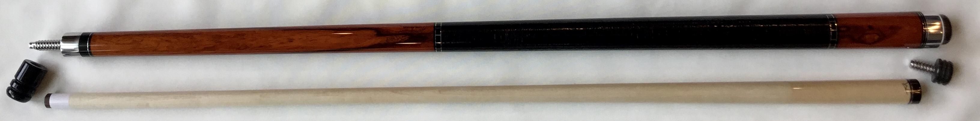 Cocobolo, low deflection shaft, alligator wrap, silver rings, ss joint, 3/8 10, aerospace aluminum butt cap, custom joint protectors. If you are interested in this cue or a custom, please give me a call on my cell, 405-544-2076
