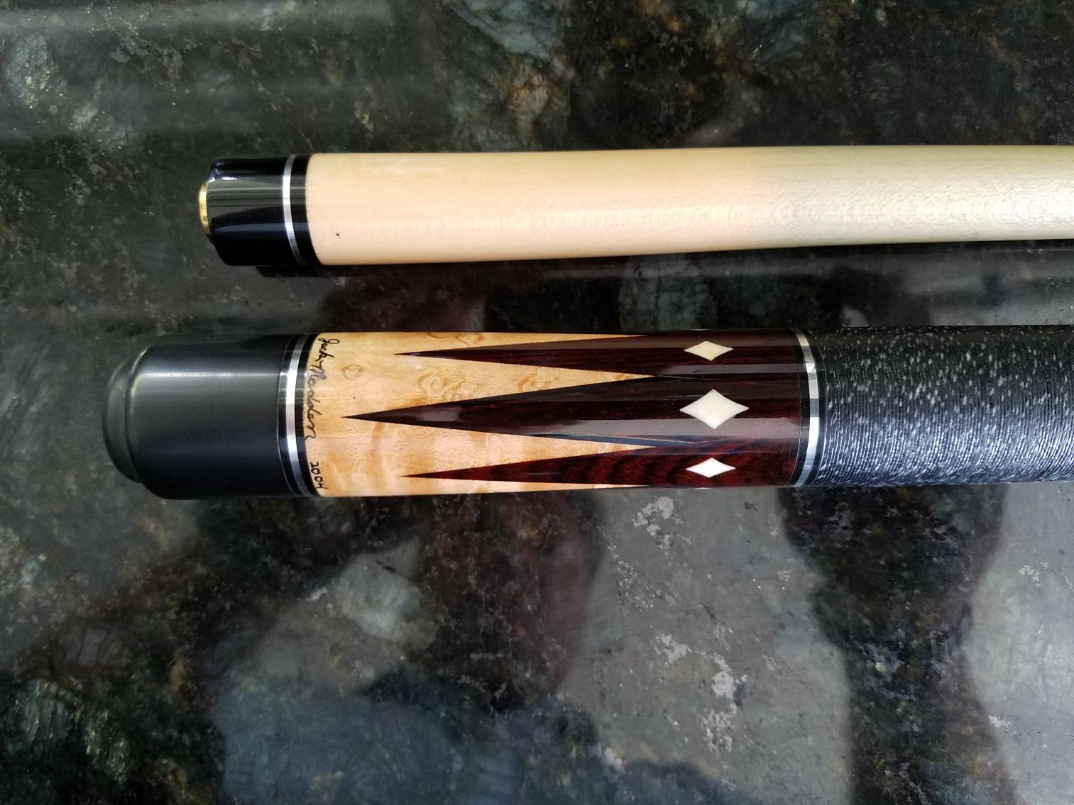 This cue is in excellent shape. Butt weighs 16.3 oz, shaft weighs 3.9 oz and 12.4 mm. Cue is being offered for a great price of $600