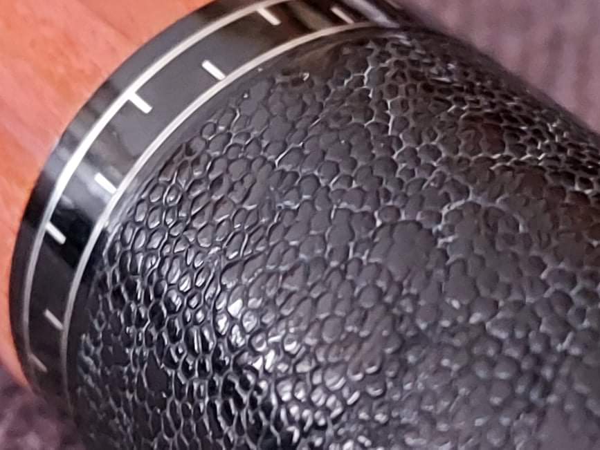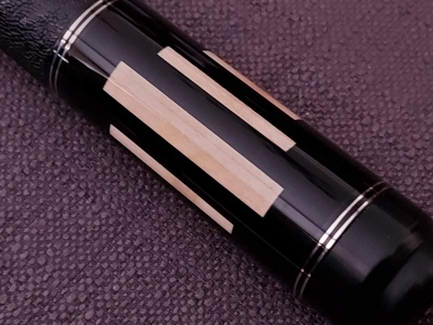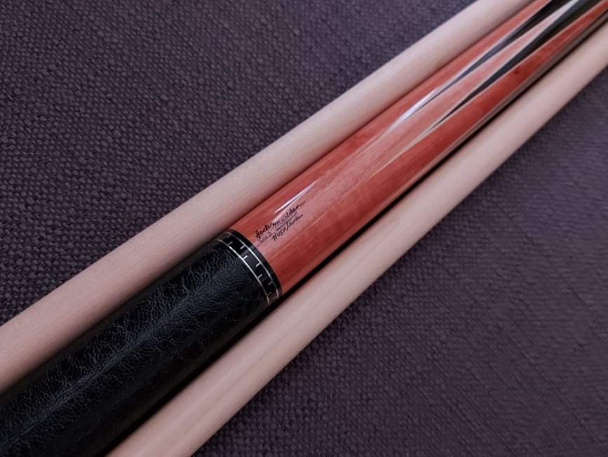 This cue comes with three shafs. It features 8 Pink Ivory points recut into Holly points, that are cur into Gaboon Ebony. The points are razor sharp as you would expect from Jack. The Ebony butt sleeve has eight Holly boxes. The wrap is genuine EE. It has a half stainless steel sleeved joint with a 3/8x10 pin.