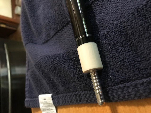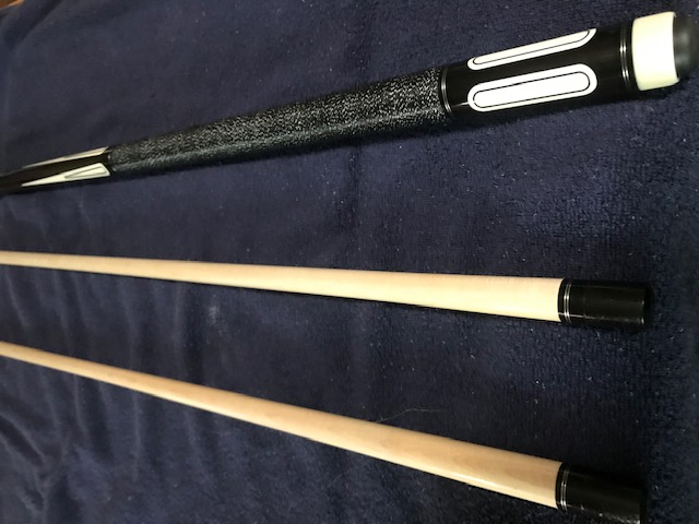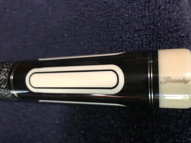 This cue was made about 17 years ago by Jacoby Custom Cues for an individual in California. . The cue is ebony and iv-ry. The cue has 4 floating iv-ry points and 4 large iv-ry boxes/ovals in the butt-sleeve.The collar and butt-cap are also iv-ry. Ringwork is double nickel silver rings. The butt weighs 15.6 ounces. Shaft 1 weighs 3.8 ounces with a 13mm tip. Shaft 2 weighs 3.4 ounces with a 12.9mm tip. It has a black with white spec irish linen wrap. The joint is iv-ry flat faced with a radial pin. The cue is in excellent condition. Dave said the retail price of this cue today would be $2600+ . there is not a mark on it .