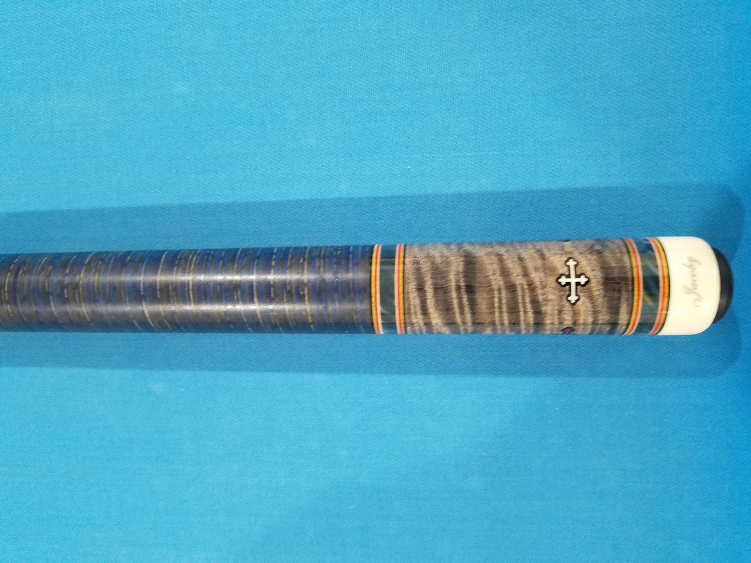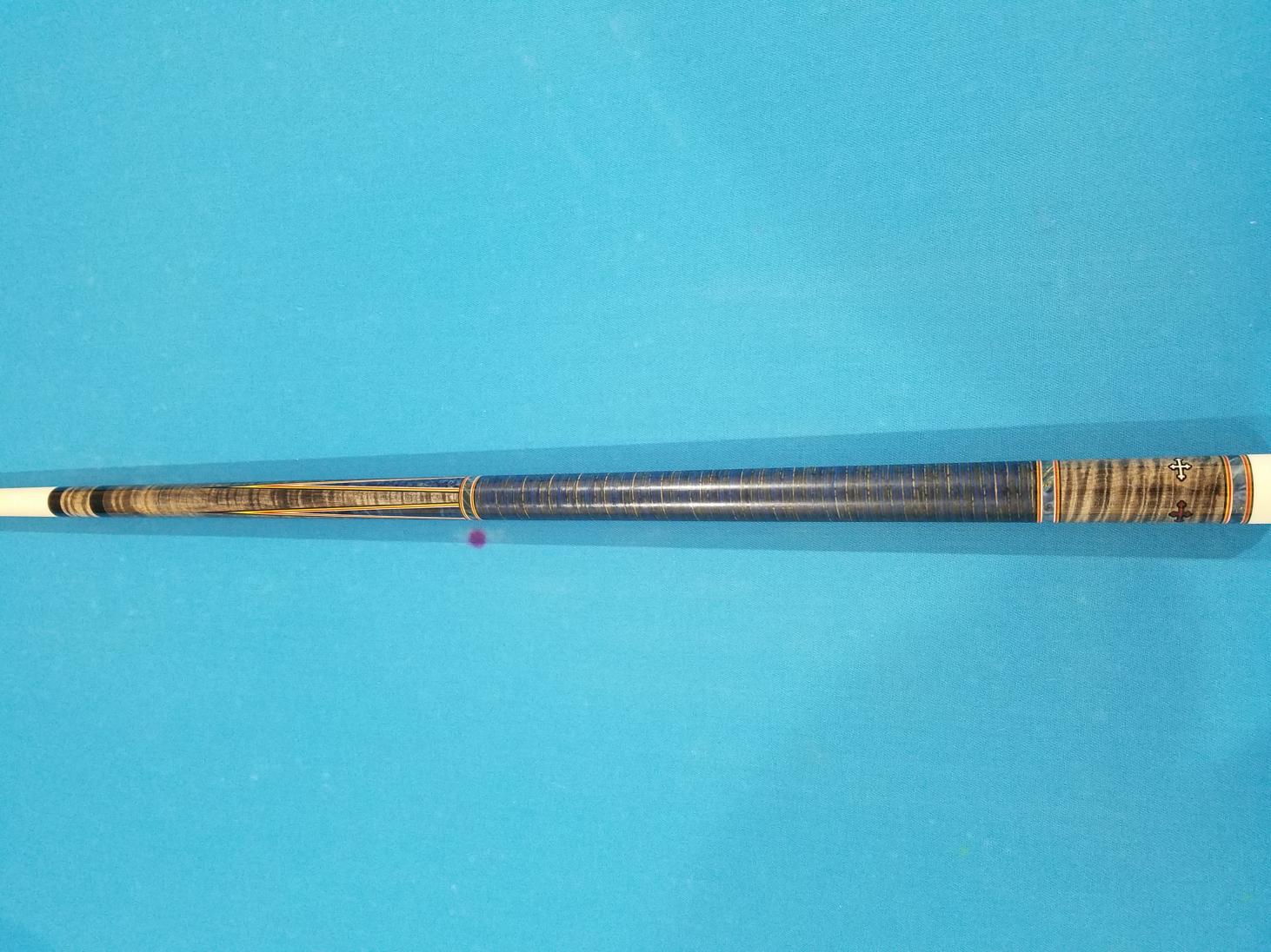 Gray stained curly maple with blue box elder points holly and red box elder crosses in the butt cap. Blue and black stacked leather wrap had cue made and never use it. . Shaft is standard maple navigator med tip. Shipping included in the lower 48. PayPal only friends and family preferred or add 3 percent. Email dbuck428@gmail.com or txt 2409252616 for any questions $850 will provide more pictures upon request.